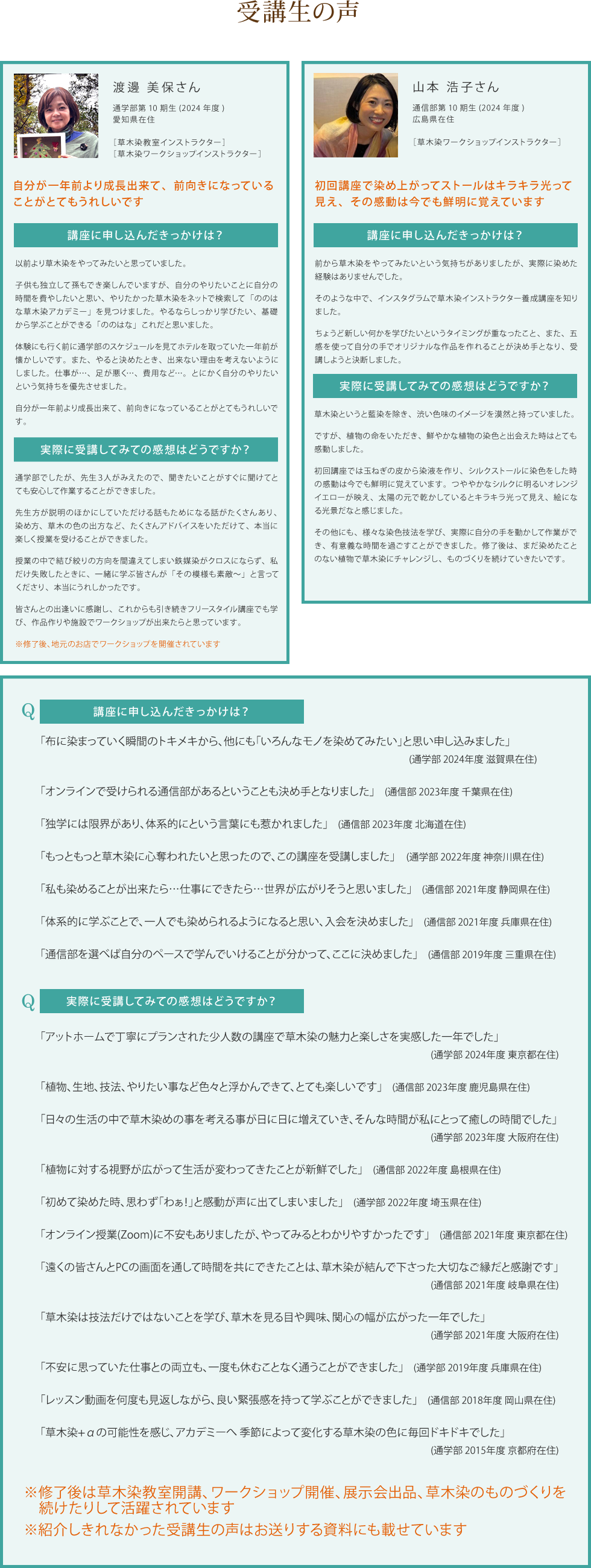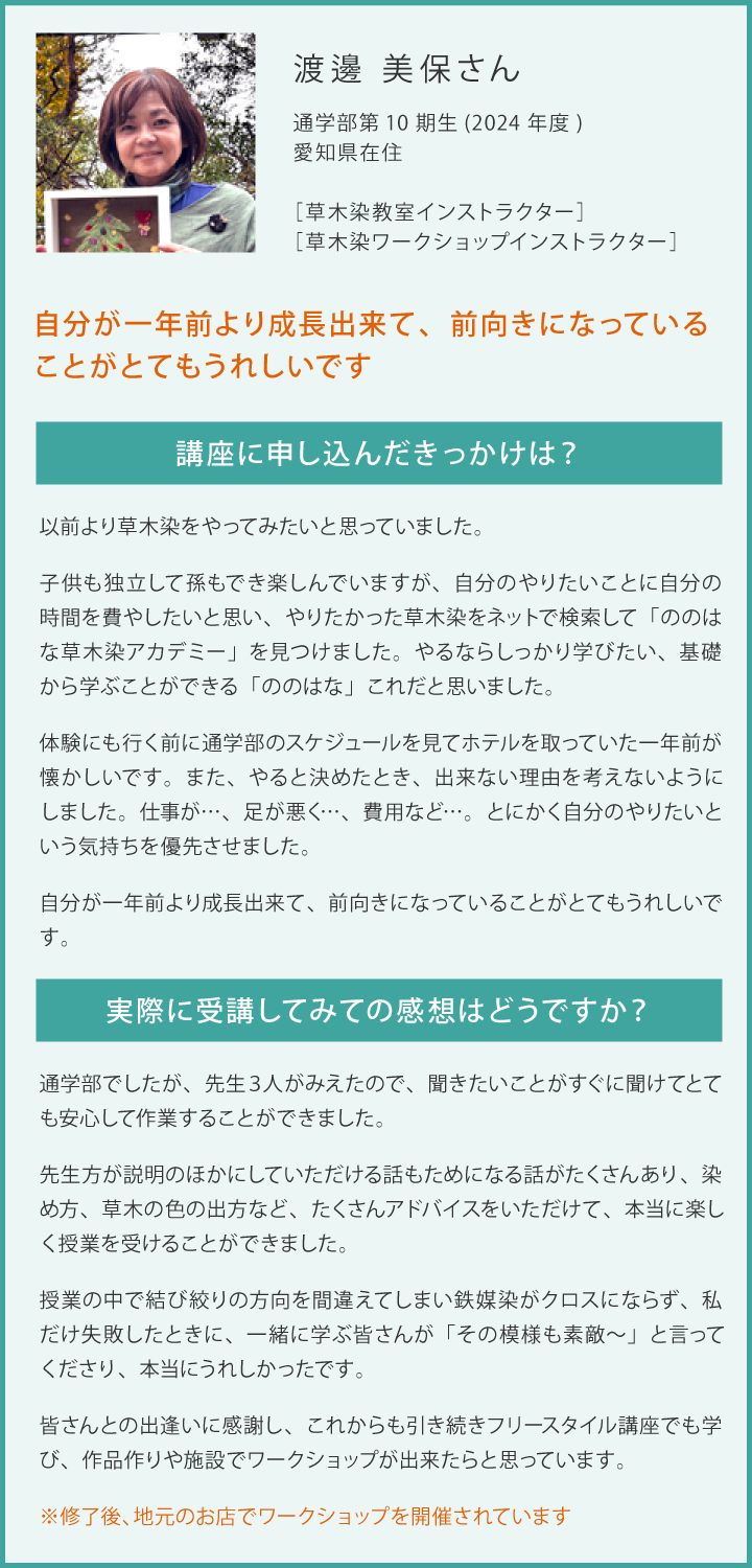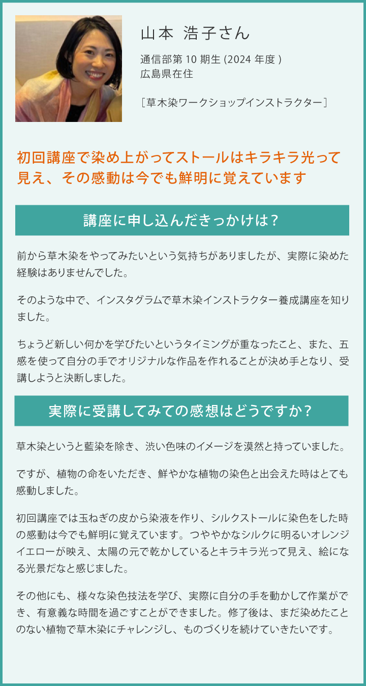 「草木染+αの可能性を感じ、アカデミーへ。季節によって変化する草木染の色に毎回ドキドキでした」