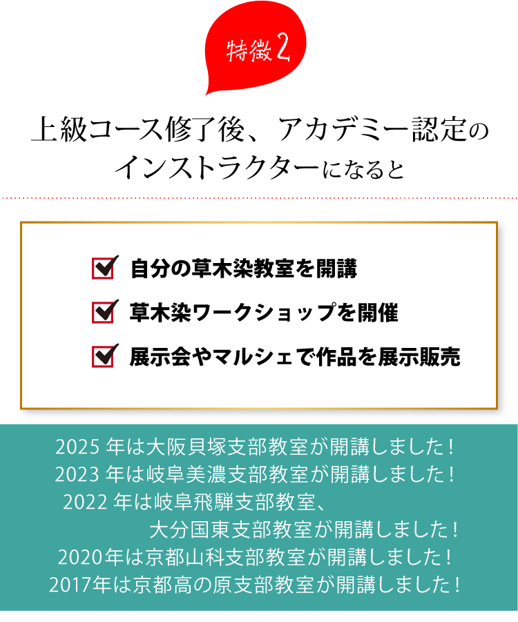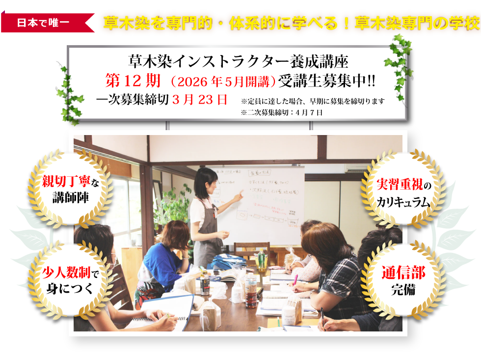 ★下記日程の草木染体験&説明会に参加し、今年度にインストラクター養成講座にお申込みされた方には、参加費6,500円を全額キャッシュバック(アカデミーで材料等の購入に使える、6,500円分のクーポンをお渡し)いたします。 実質無料で体験できますので、ぜひご参加ください。