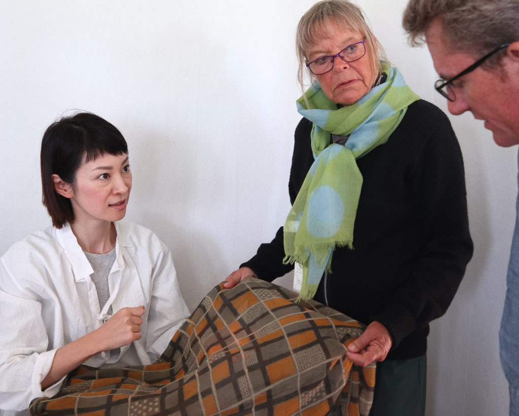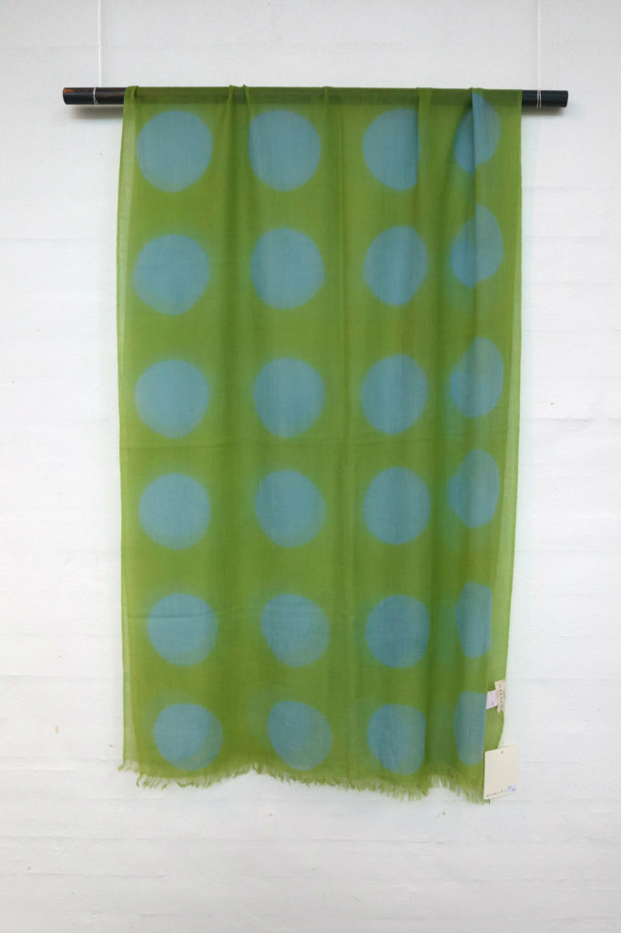 Birgitteさんは展示会の初日に来られて、黄緑色のベースに板締め絞りで水色のドット模様に染めたストールをお買い上げくださいました。メリケンカルカヤの黄色に藍の乾燥葉のブルーを重ねて染めています。