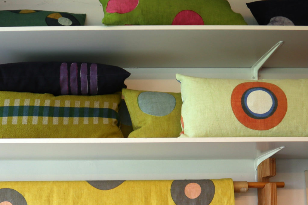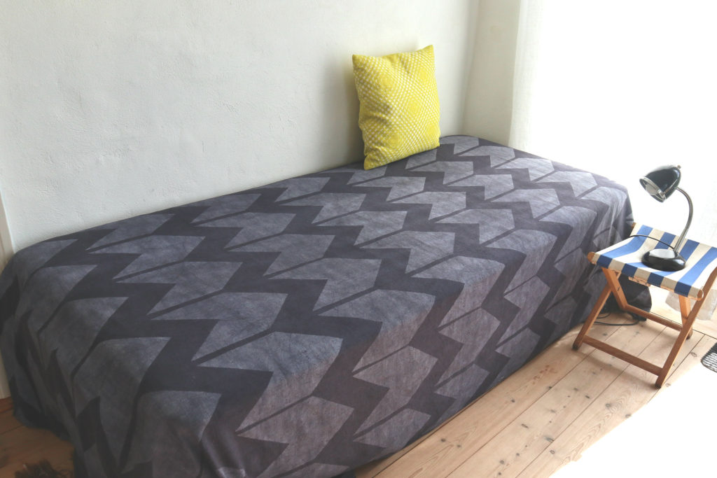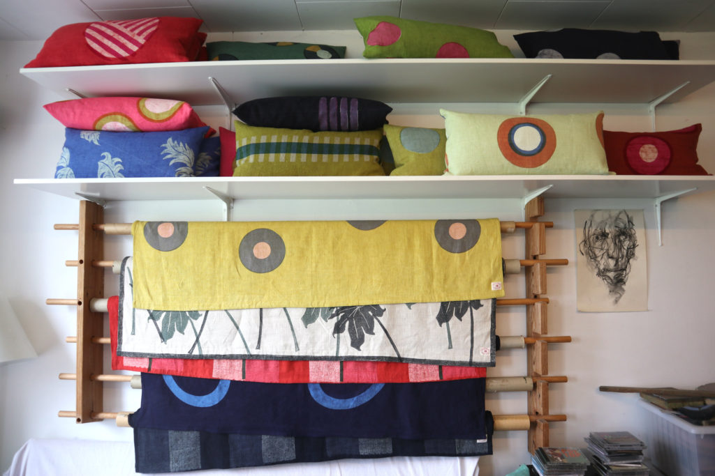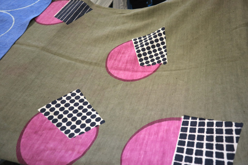 Birgitteさんの作品はシルクスクリーンによるハンドプリントで、オリジナルデザインの版を使ってざっくりとした風合いの麻生地に染められています。
