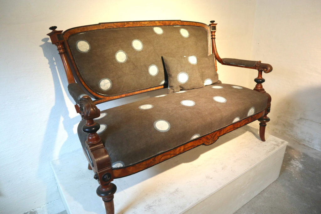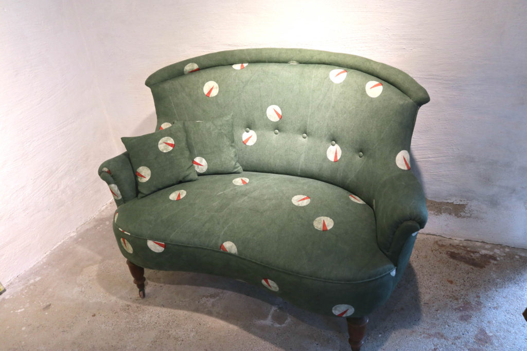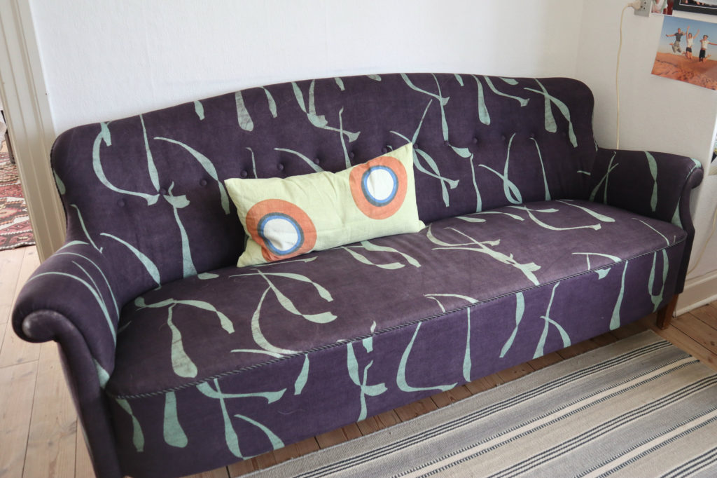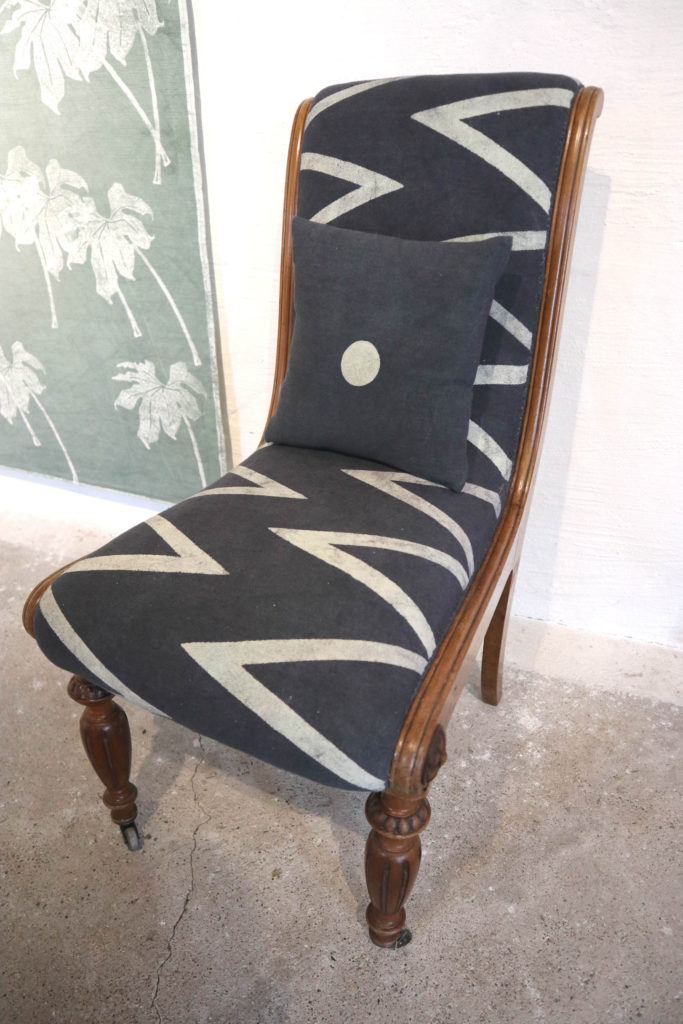 クラシックなデザインのアンティークの椅子にBirgitteさんの北欧モダンな布を組み合わせるという感性がすごくいいなと思いました。デンマークの人は家でも家具でも古いものを修理しながら大切に長く使う文化が当たり前だそうで、こうして古い椅子も布を張り替えて使う人が多いのだそうです。素敵な文化ですよね。