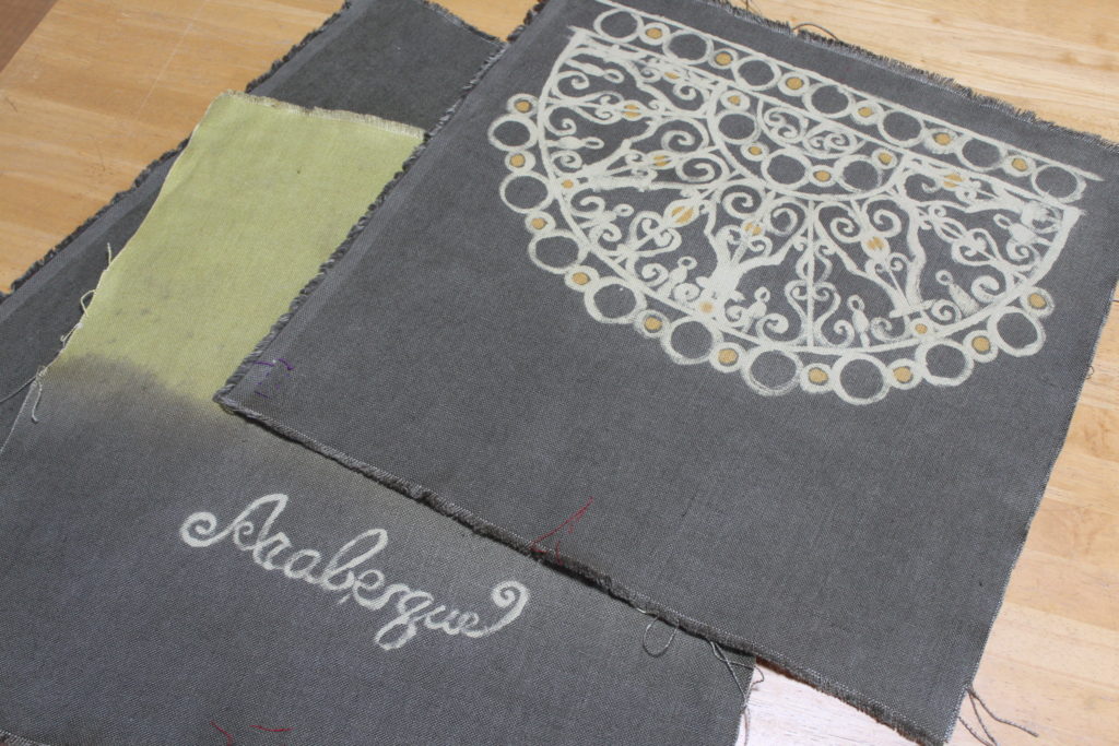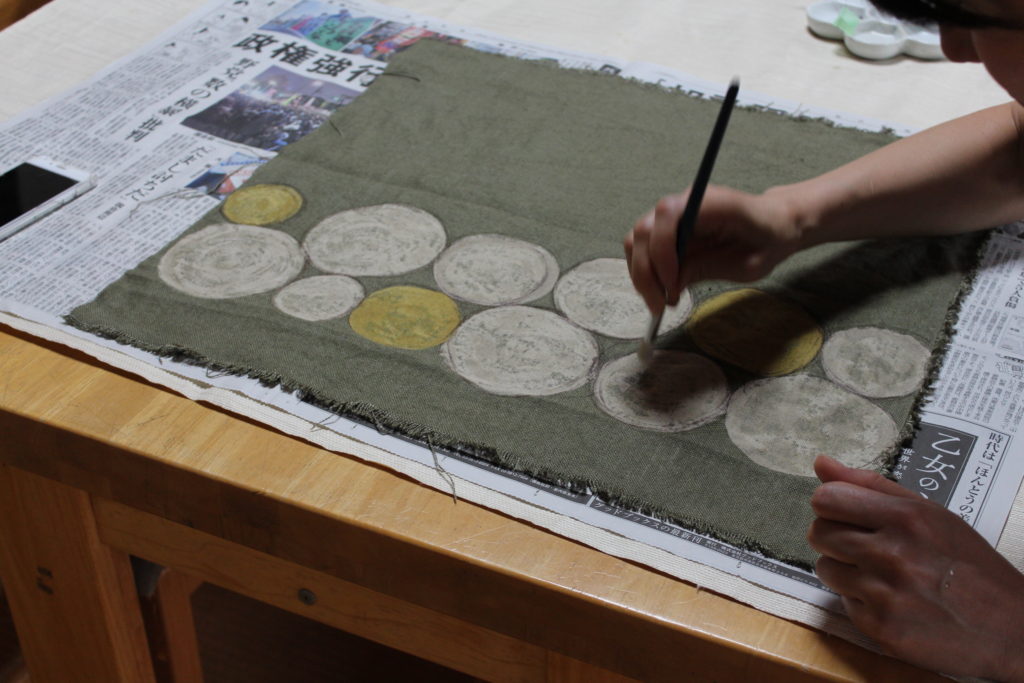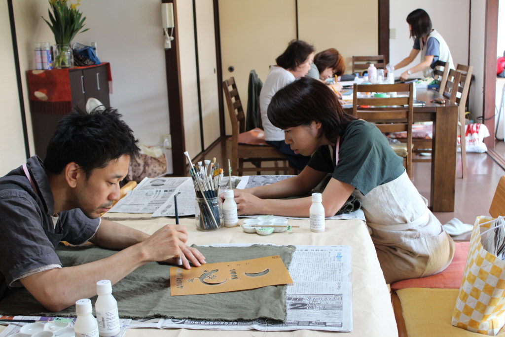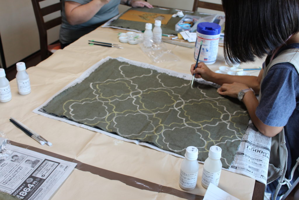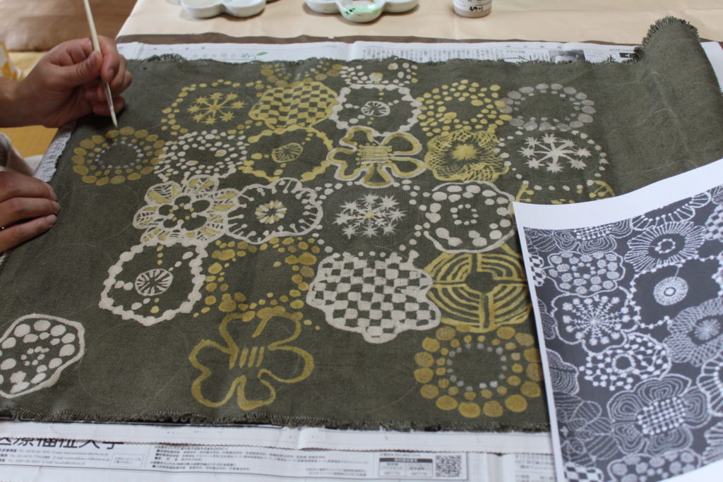 インストラクター養成講座中級コース8月の授業2日目は、赤紫蘇で染めた布に着抜技法を使って模様を描いていきます。