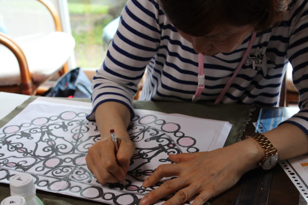 刺繍模様から図案を考えられたHさん。びっしりと詰まった模様をほぼフリーハンドで描かれました。線が書きなれていて、速度もとても速かったです。