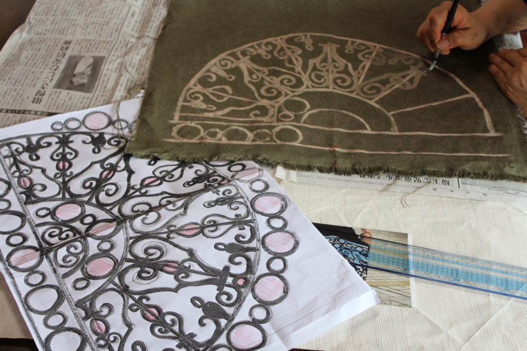 型紙がカットできたり、図案を写し終えたら、いよいよスズとチタンの着抜液で描いていきます。