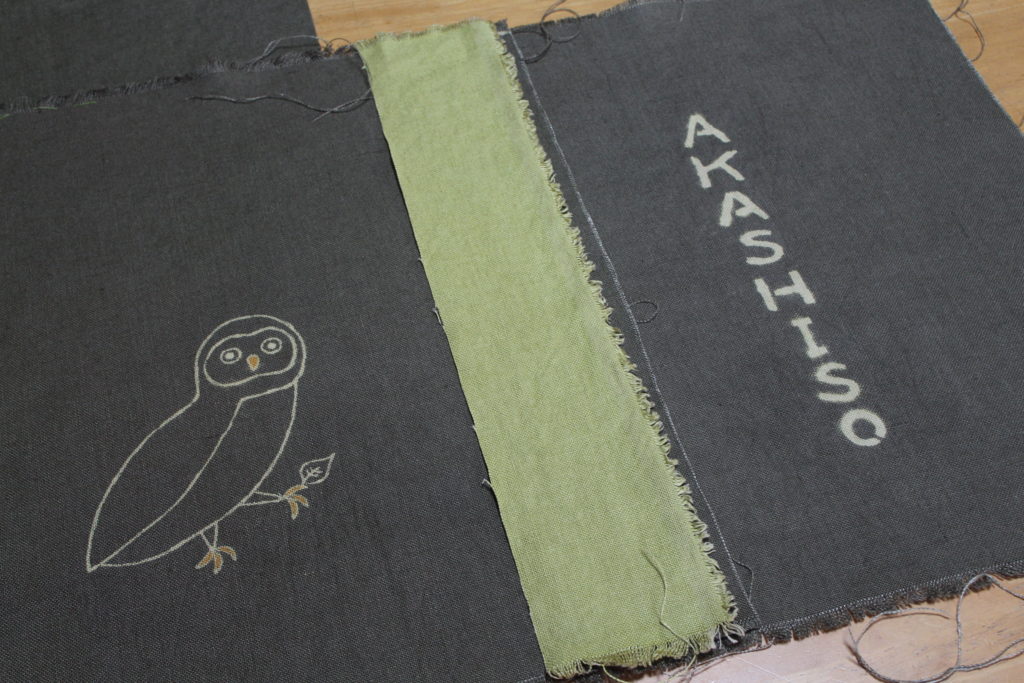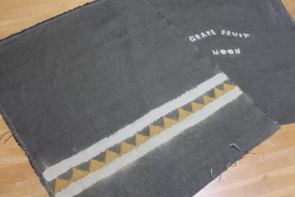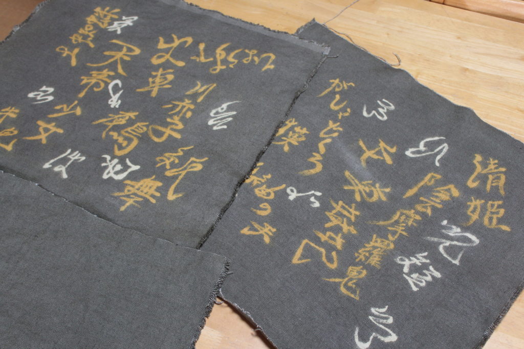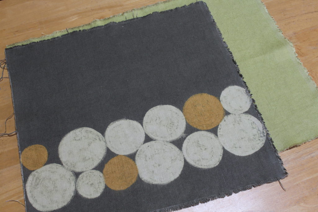 授業1日目に赤紫蘇で染めた布が、ミョウバン媒染できれいな緑系、鉄媒染でカーキ色のような渋い色でしたね。自分の麻生地の端っこで、スズとチタンの着抜液でどのように色が変化するかを確かめてみましょう。