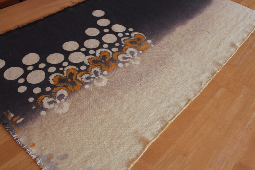 通信部のIさんの作品です。棉(わた)をご自身で育てたり植物が大好きだそうで、お花や枝、葉っぱなどをモチーフにされています。通学部とは違って、ご自宅で染められたので、地色はセイタカアワダチソウの鉄媒染となっています。