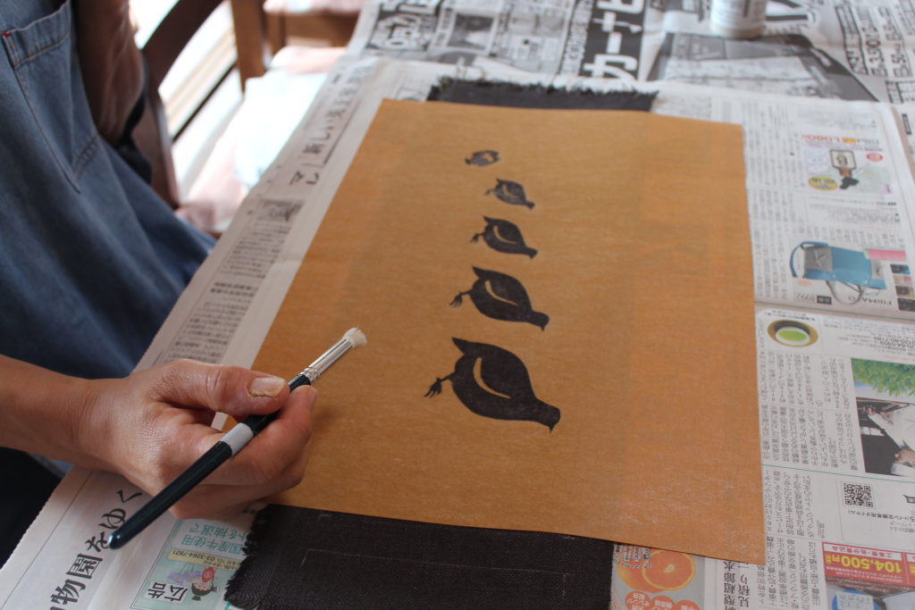 1日目にアカメガシワで黒く染めてあった布に各自が考えてきた図案を写し、スズとチタンの着抜液で模様を描いていきます。