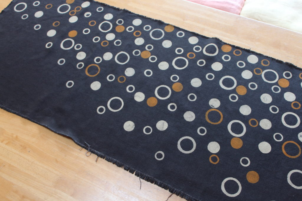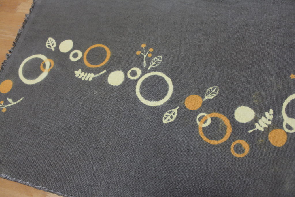 セイタカアワダチソウで染めて鉄媒染をし着抜したそうですが、手描きと判で押した模様がリズミカルに並んでいて、たのしい模様です。葉っぱや実など、植物との触れ合いが楽しいという気持ちが現れていますね。