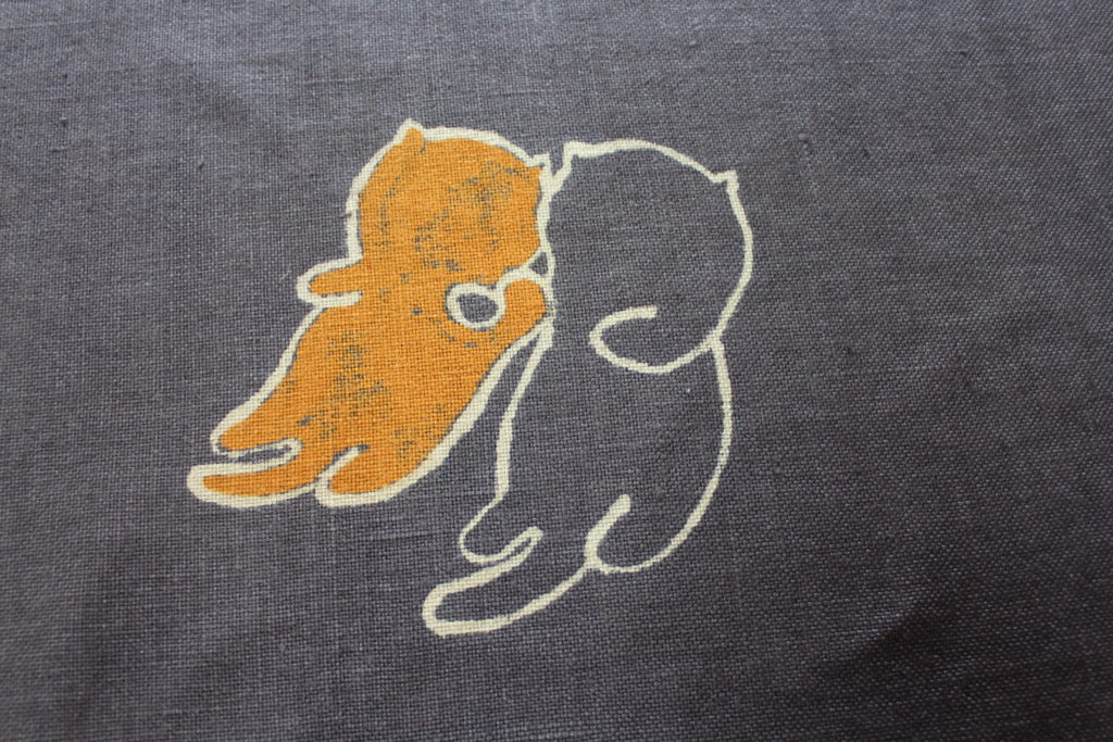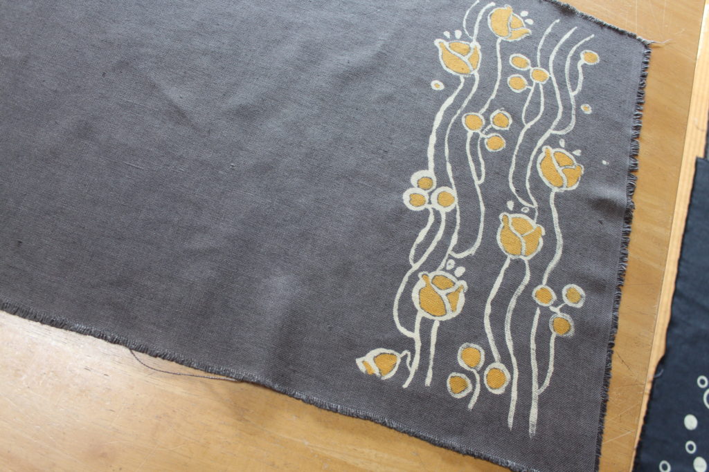 次の2点は、通信部のお二人の作品です。動画を見ながらご自宅で図案を考え、草木染をしてから、着抜技法で模様を描かれました。