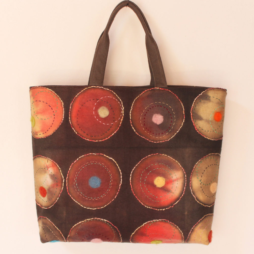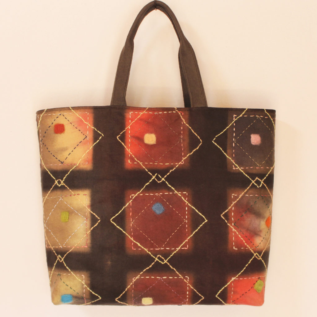 用いた技法:多色の斜めぼかし染め、板締め絞り、刺し子刺繍、ニードルフェルティング
