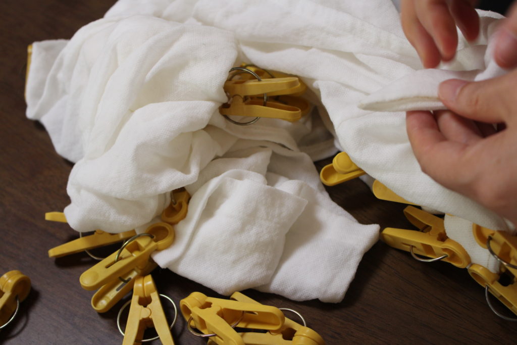 折りたたんで、洗濯ばさみで止めます。