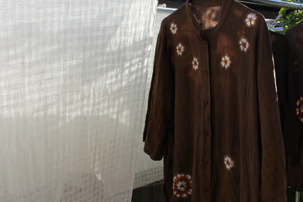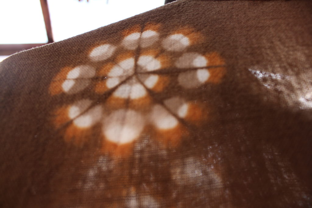 1日目は、綿のブラウスを工房の庭で摘んだキバナコスモスで、花火のような模様に染めました。