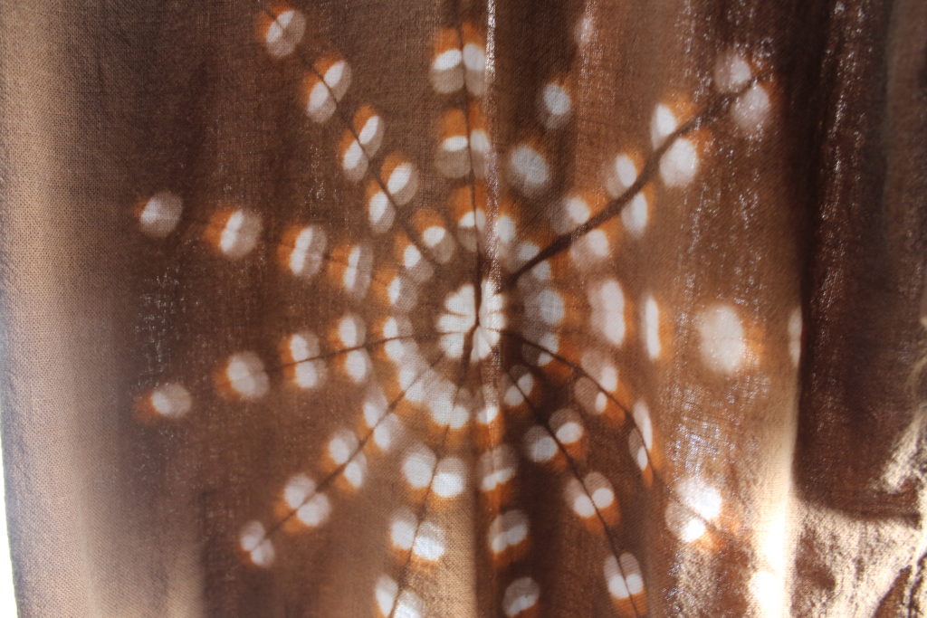 1日目に、シルクコットンのストールに各自好きな板を使ってユーカリで板締め絞りを施し、鉄媒染で染めてあります。