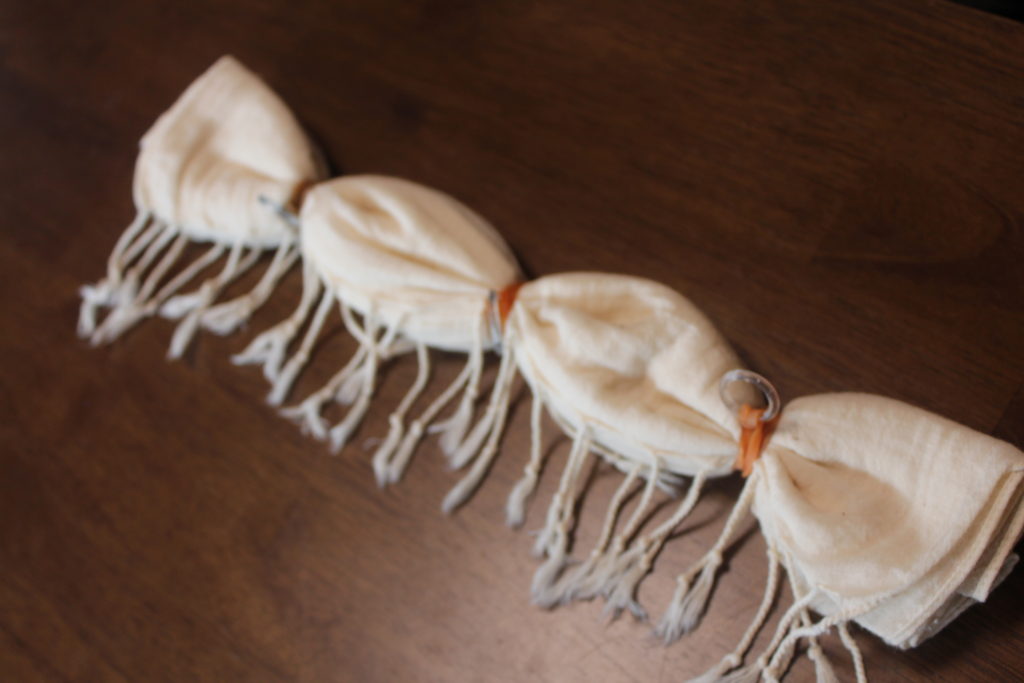 手順は、折りたたんで輪ゴムで止めて染液で染める→もう一度輪ゴムで防染して鉄媒染するです。