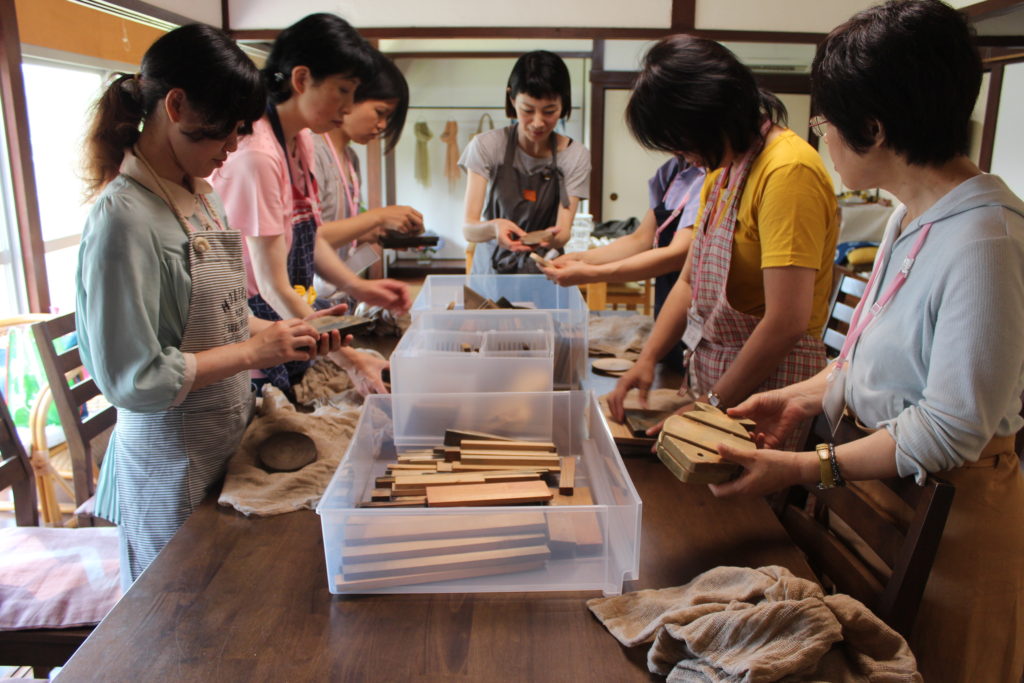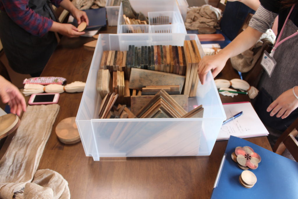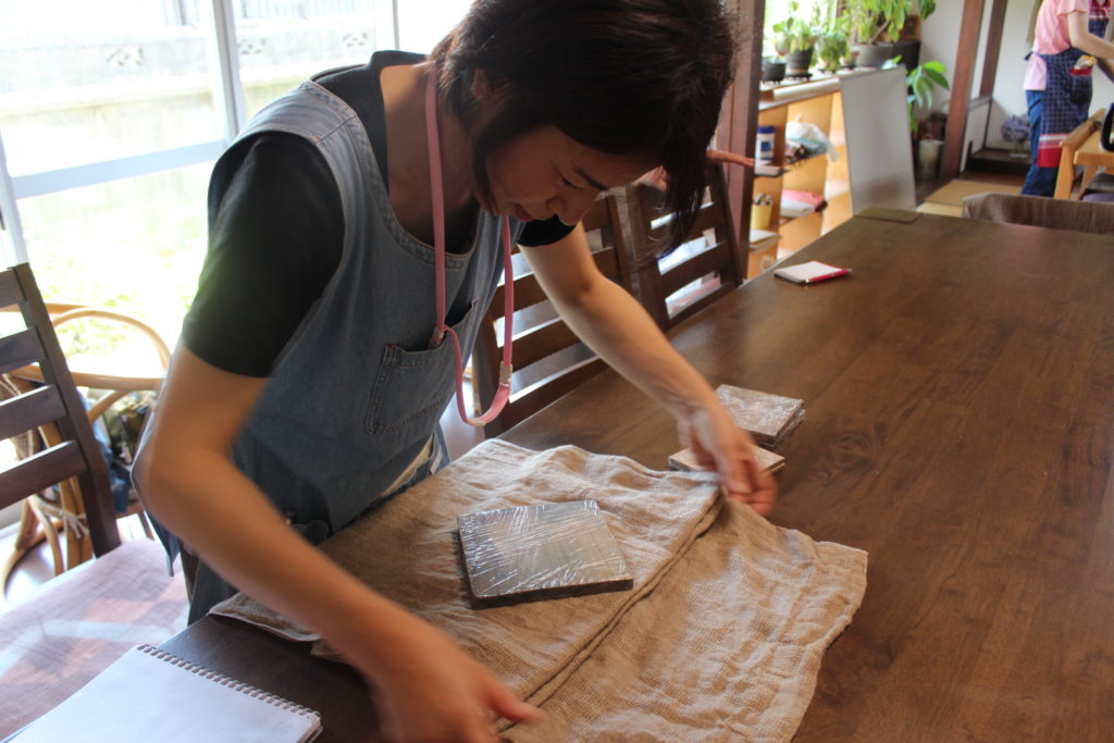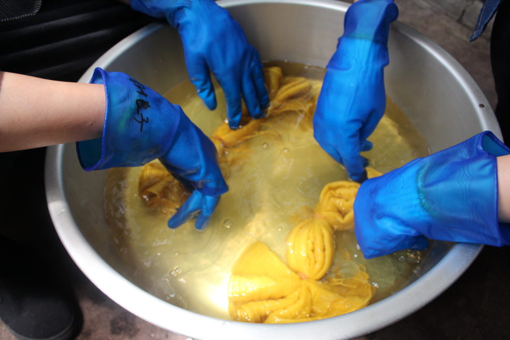 さすがに皆さん、折りたたみ方や多くの板からどれを選んでどの様な模様にするかを考えあぐねていました。板同士の間が狭すぎると染まりにくいとか布を折りたたみ過ぎると板の模様がはっきり出ないので、どの程度の厚みが良いのか等、一人一人に寄り添ってアドバイスしました。