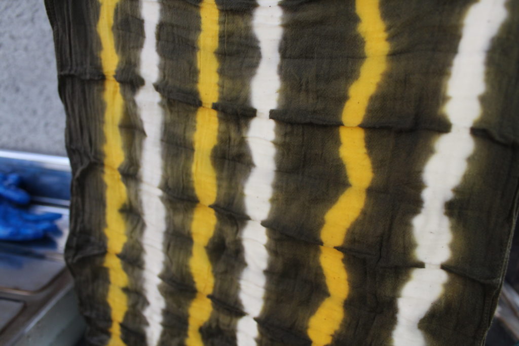 やはり違いが出ていますね。植物からもらう色は、黄色と言っても様々なニュアンスの黄色になるのが面白いですね。3色のきれいなライン模様のストールが出来上がりました!
