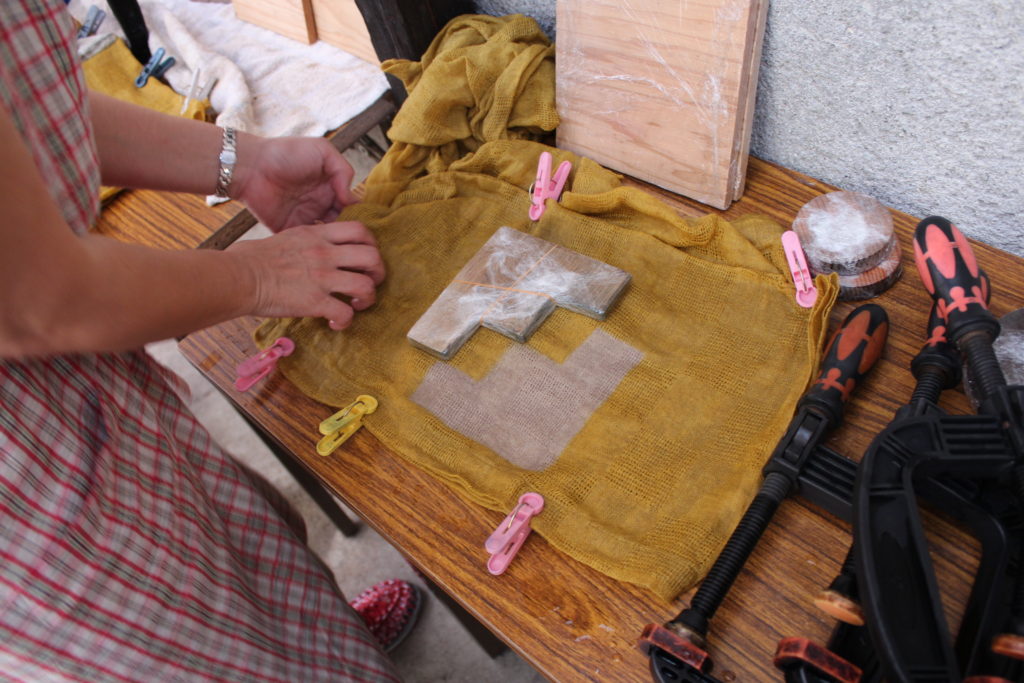 さて次は、90×150センチサイズの市松模様に織られた麻のれんを染めていきます。1日目に染めた麻ストール板締め絞りの応用編です。出来上がりまでをイメージして、板の形を選んだり折りたたみ方を考えたり、今まで以上に鍛えられる作業となっています。