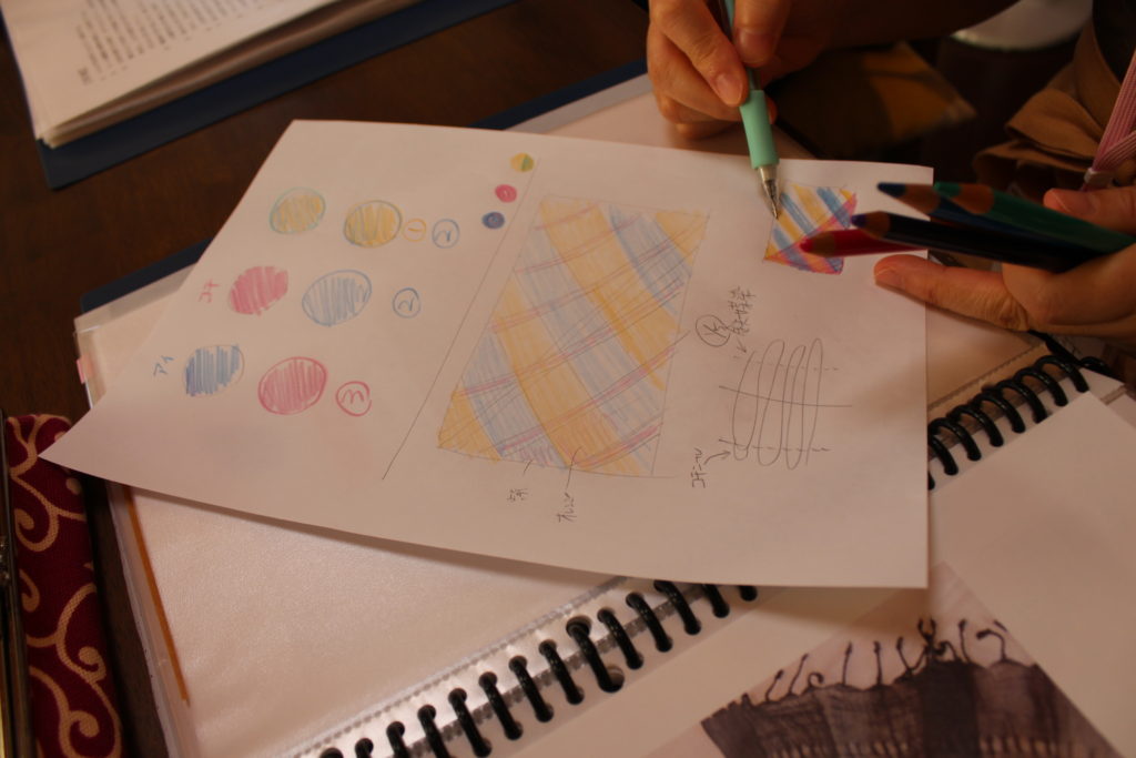 ミョウバン媒染で染まる色をメインに、色の組み合わせや重なりをイメージしてデザインを考えます。白く残す部分や染める巾など、イメージすることは山ほどあって、先を見通してデザインすることの難しさに、みなさん一寸混乱されていましたが…