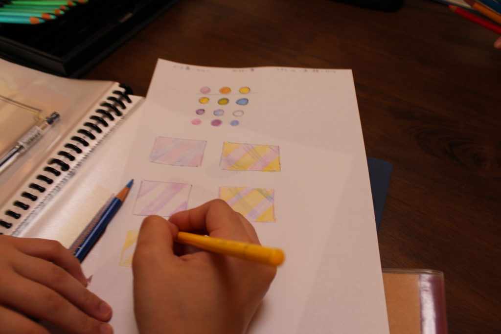 色鉛筆を使って、植物の色を思い浮かべ、どの様な色で斜めぼかしをするかを考えます。