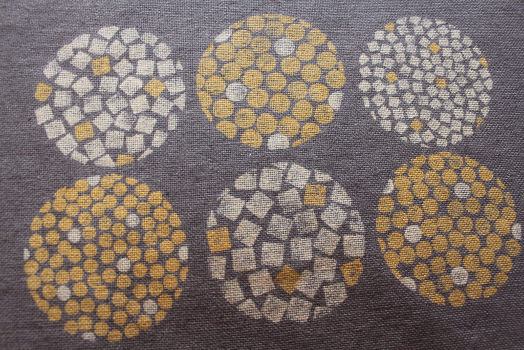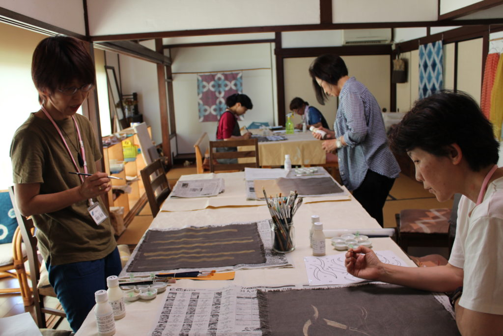 田方さんは、テキスタイルデザインの仕事をされています。今回もパソコンで図案を書いてきました。自分で考えた図案を一筆一筆、錫とチタンの着抜液で丁寧に描きました。両サイドぐるっと途切れることなく連続した模様になっています。「こんな風なものづくりが仕事にできればな~」とおっしゃっていました。