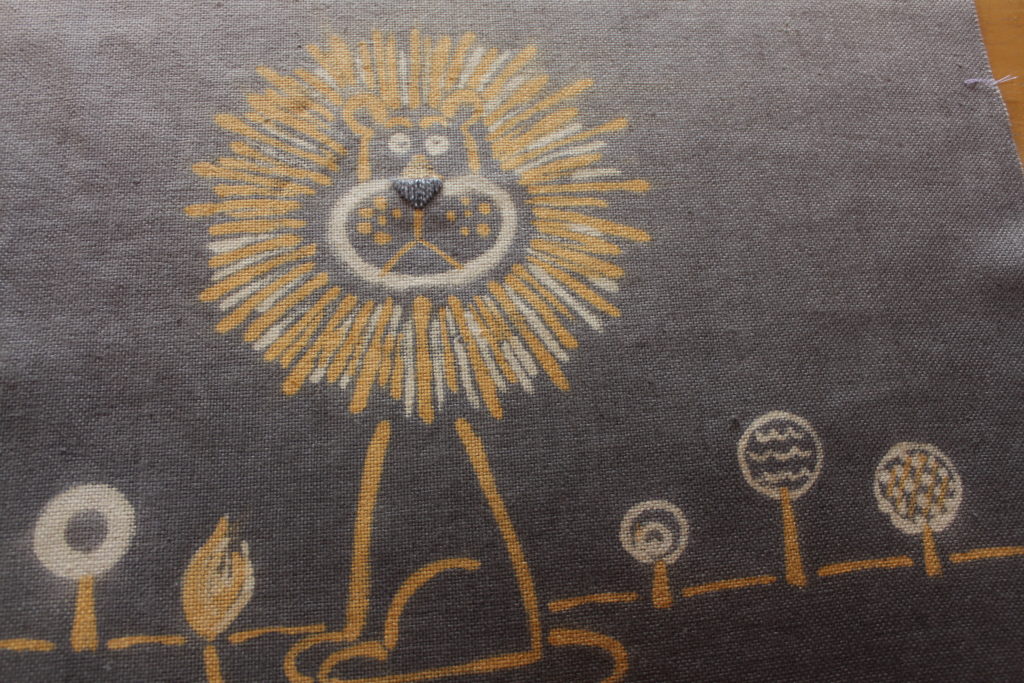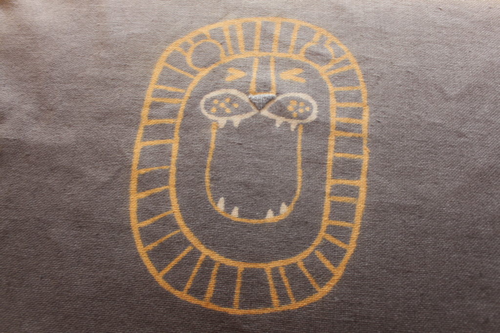 田中さんは、ライオンを絵本風にデザイン。月桂樹で染めて、ミョウバン媒染の部分を少し残してぼかし染めで鉄媒染をしているのがおしゃれですね。ライオンの鼻には生地をほどいた糸で刺繍が!ちょっとしたこだわりがポイントです。