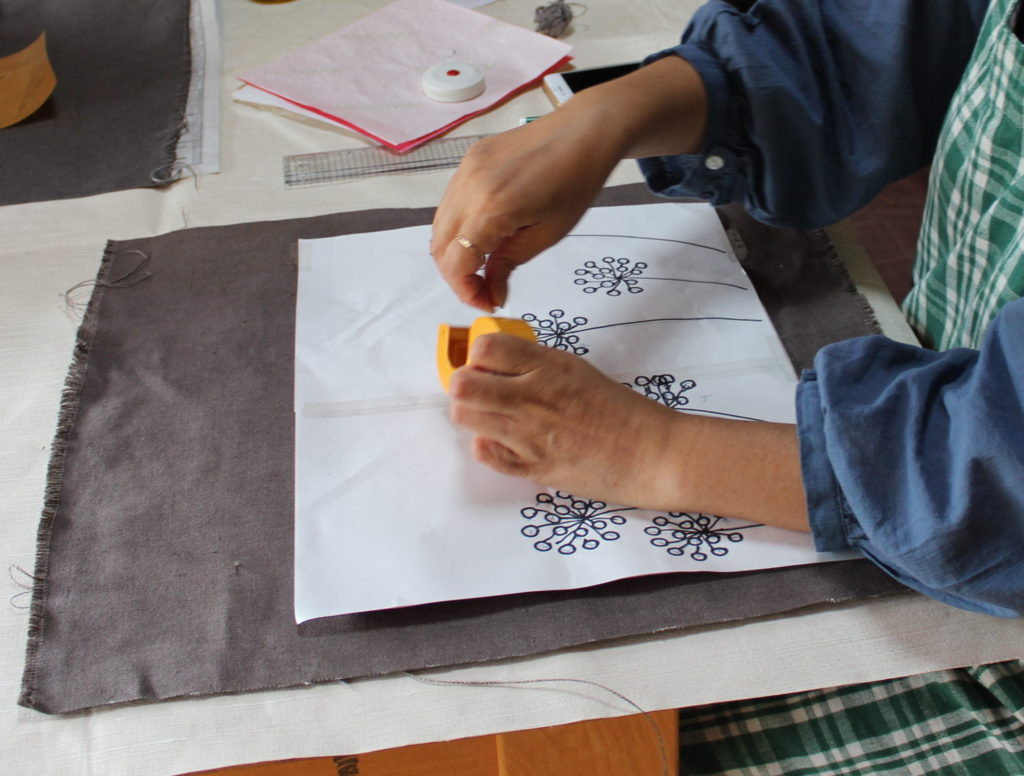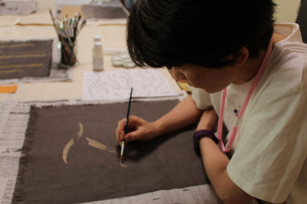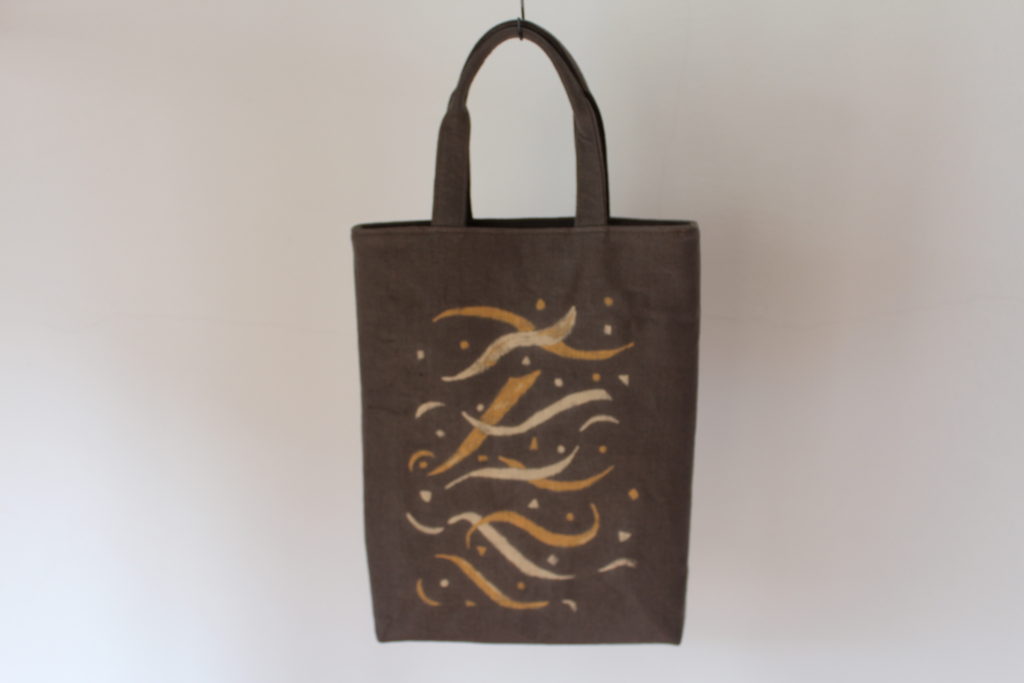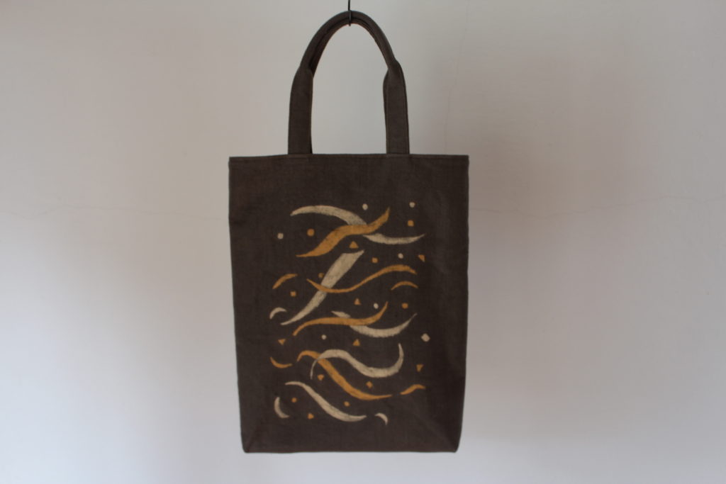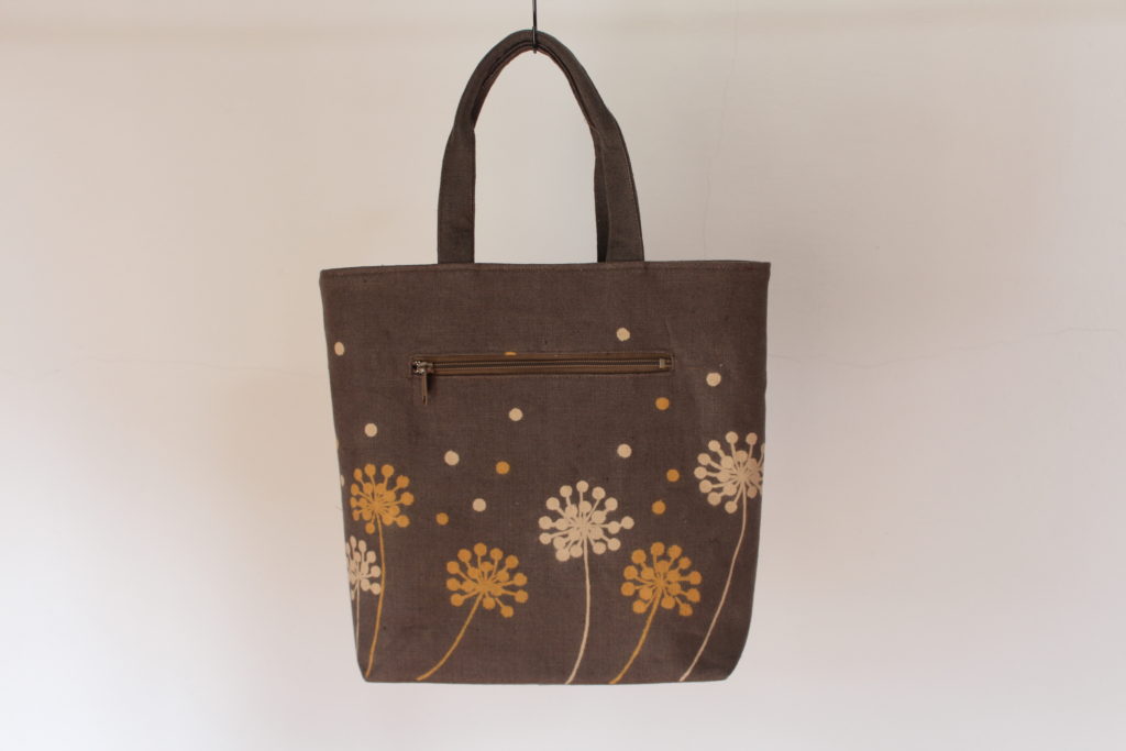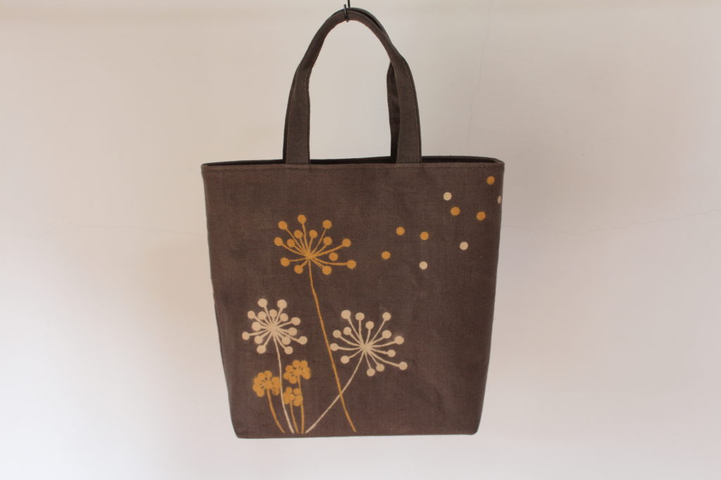 神奈川県川崎市の遠方からいつも朝早く自宅を出て参加の清水さんは、タンポポのようなお花を描きました。お花の数や、その配置に迷っていましたが、バランスの良いかわいらしいバッグになりました。風に吹かれてなびいている様子が目に浮かびます。