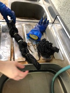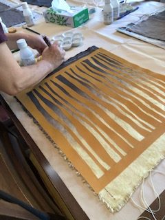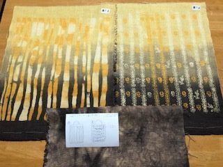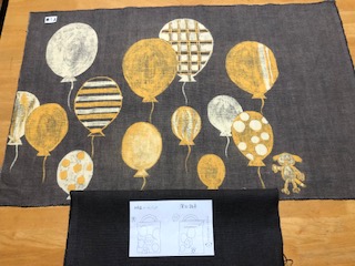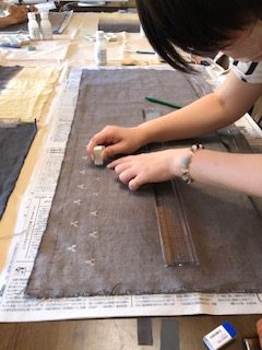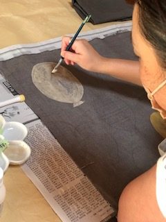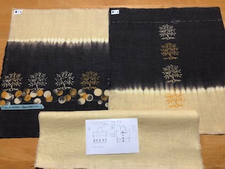 通学部は全員ユーカリを使って、通信部はサルスベリやびわなど各自が用意した植物を使って黒く鉄媒染をした布に錫とチタンの着抜液を使って模様を描きました。筆で直接布に線や面を描いたり、型紙を彫って模様をつくったり、木版やオクラやゴーヤをハンコのように押して模様を染めたり、それぞれが思い思いに着抜液を使ってテキスタイルを染めました。