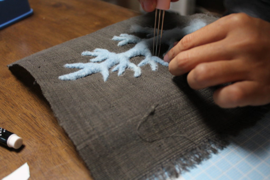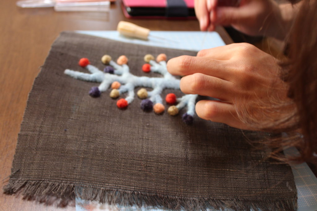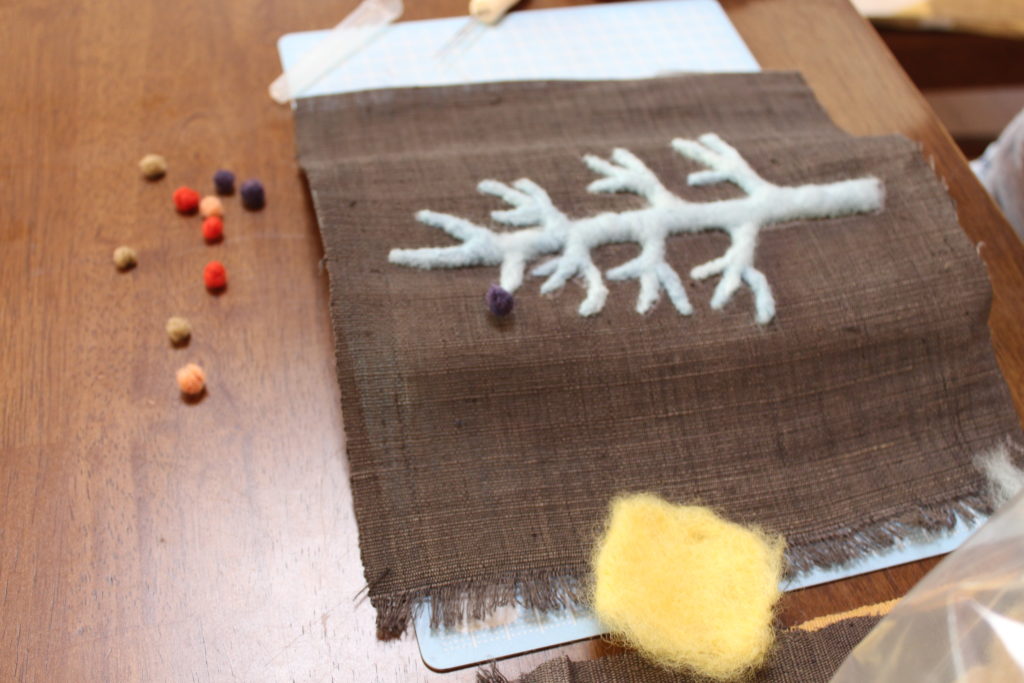 インストラクター養成講座の12月は、草木染した原毛や毛糸を使ってニードルフェルティングと刺繍の技法で額絵を制作しました。