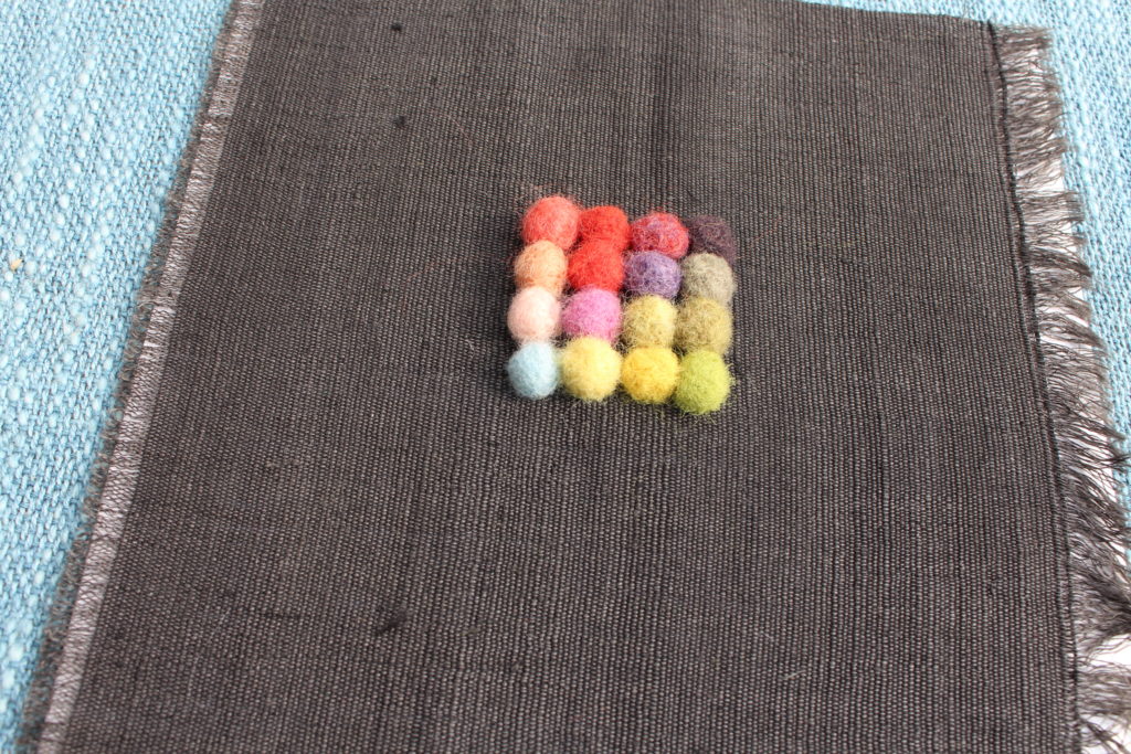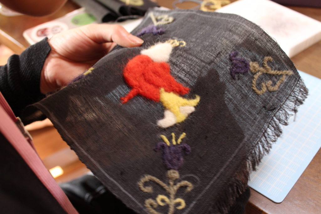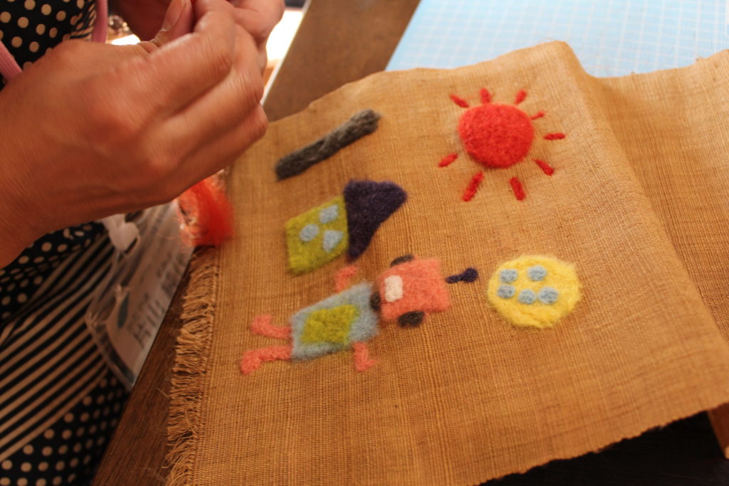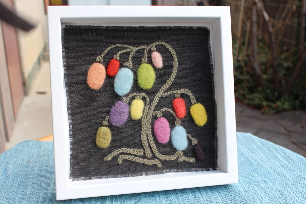 チェーンステッチもニードルフェルティングも丁寧にきれいに仕上げて、思いどうりに出来上がって良かったですね! 五色豆の ような小さな丸が中央に並ぶ、もう一つの作品も可愛く仕上がっています。小さな丸をフェルティングで布にくっつける作業は苦労したそうです。