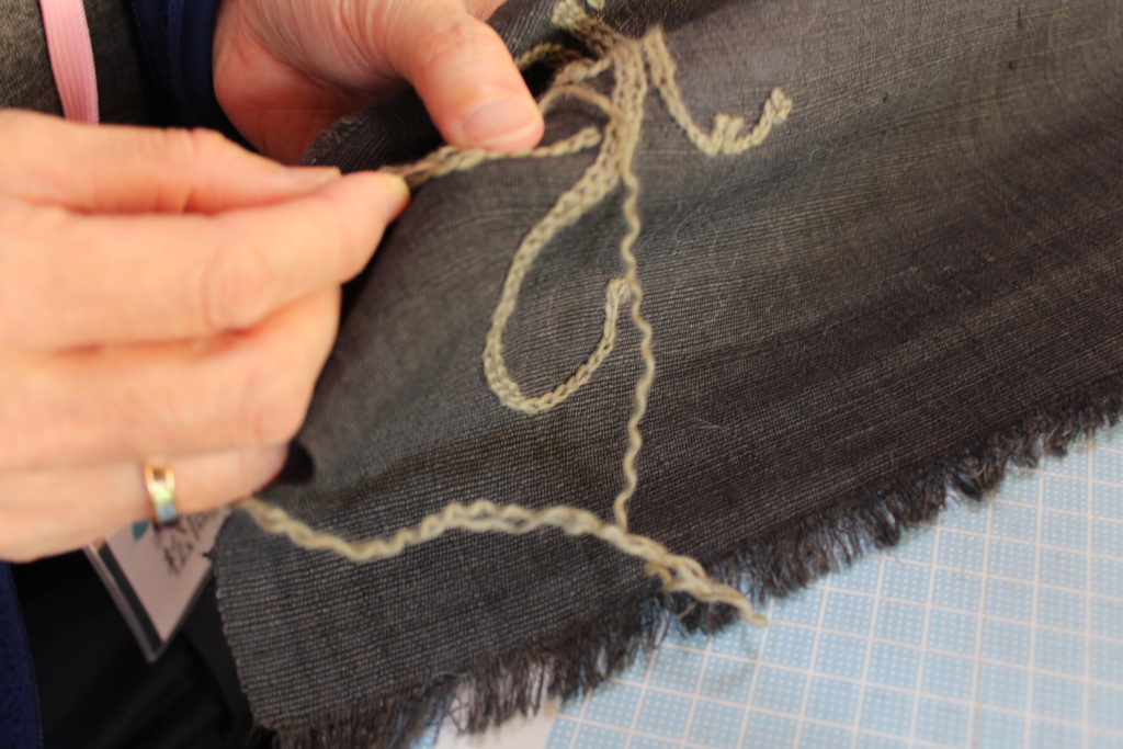 今回の授業は麻生地を栗のイガで染め、その布を額絵のキャンバスとして使います。その後、これまで草木染してきた糸や原毛を使って、各自の作品づくりをします。染めた布、糸、原毛を織や編みだけではなくこんな使いかたをすると作品づくりの幅を広げられますよ~と提案する授業です。