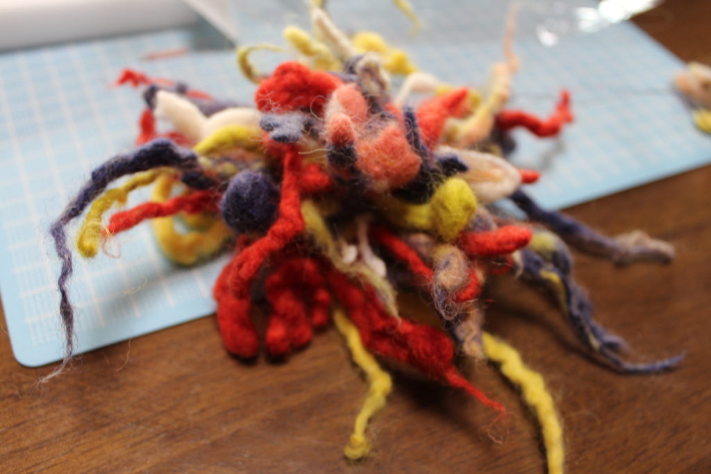 いつも元気いっぱいで、どんな作業でもチャレンジをするMさんは、多種類の原毛を石鹸を使ってフェルト化して、あふれるエネルギーを表現しました。