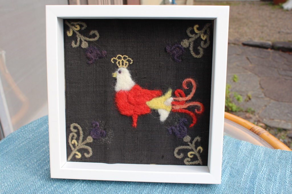 上品な色合いを背景に、すっくと立った茜色の鳥の姿が可愛いですね。四隅の花、糸の太さを替えた刺繍、原毛でフェルトした細やかな表現が、バランスよく白い額の中に収まっています。