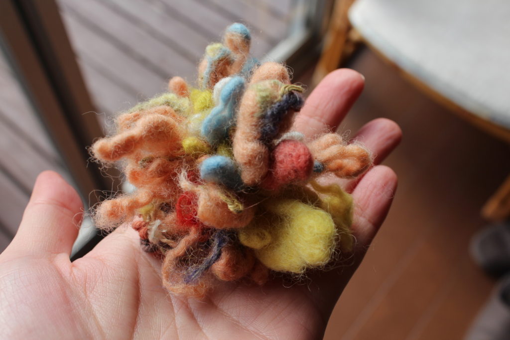 今回思いどうりの作品に仕上がったとおっしゃっていたMさん。様々な植物で染めた原毛の色どりと大きさのバランスがよく、絵として美しいですね。