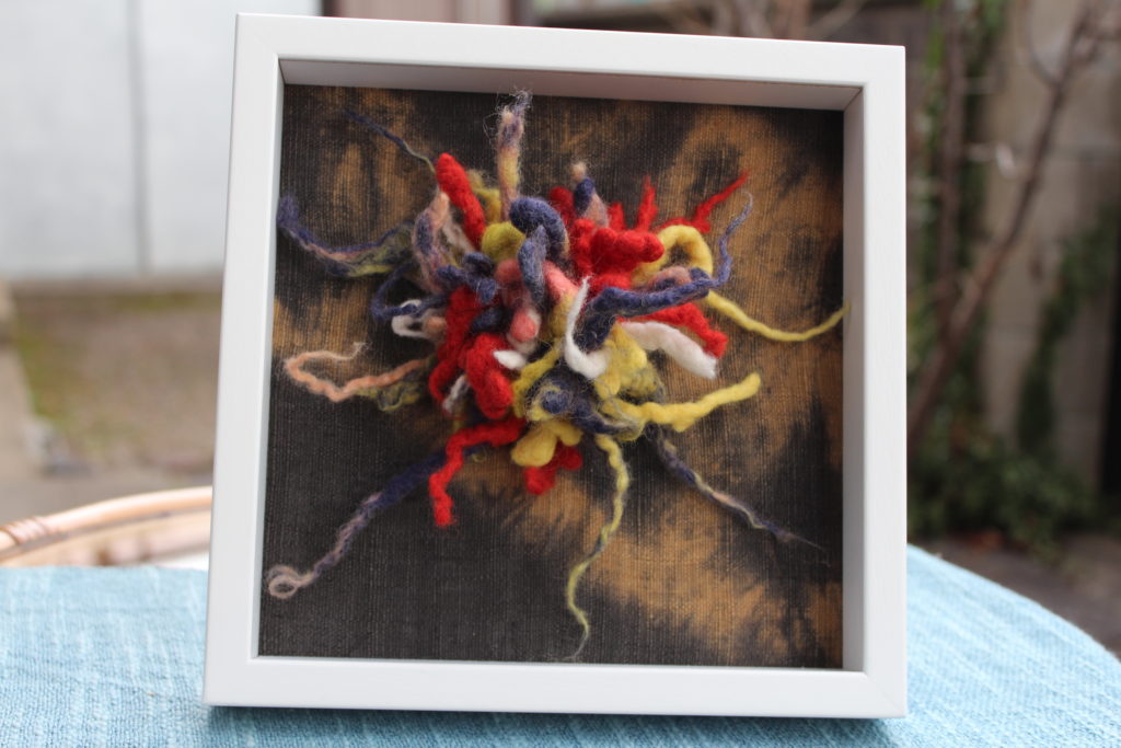 背景の麻布もただ一人絞り染めをしていて、その絞りによって原毛のエネルギーが風を巻き起こしているように見えますね。この技法でブローチも作ってみたいそうです。4月の「草木染教室展」で見られるのか楽しみです。