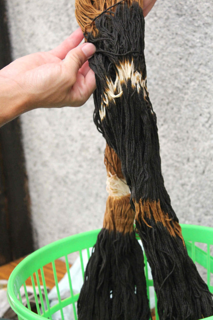 こちらはナンキンハゼの色です。ナンキンハゼは鉄媒染によく反応して黒く染まるので、色のコントラストがはっきり出て面白い模様になっています。