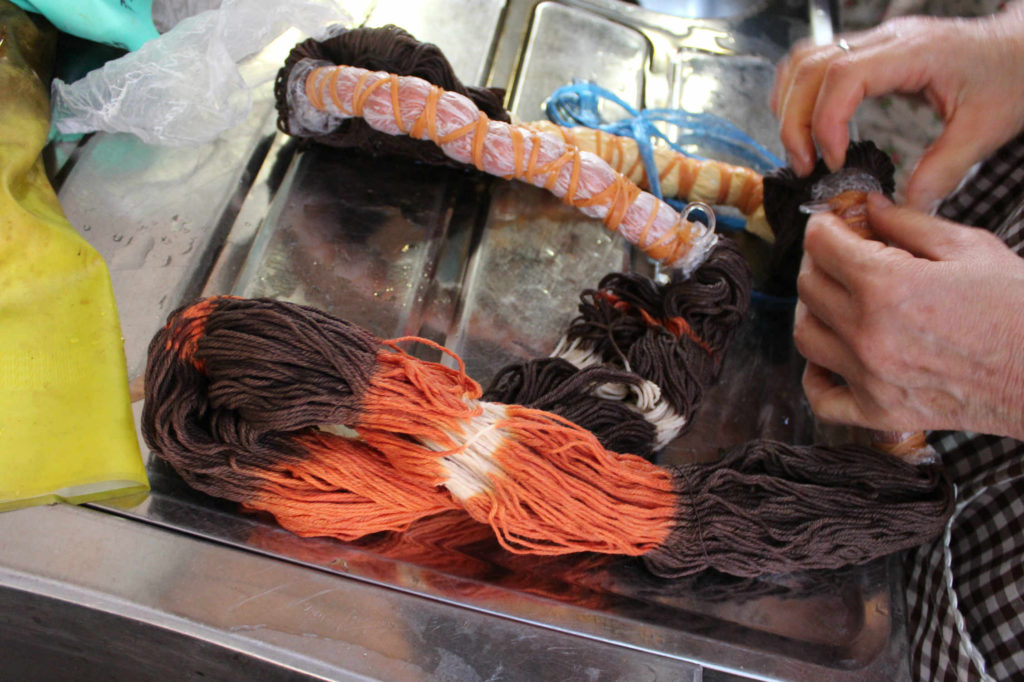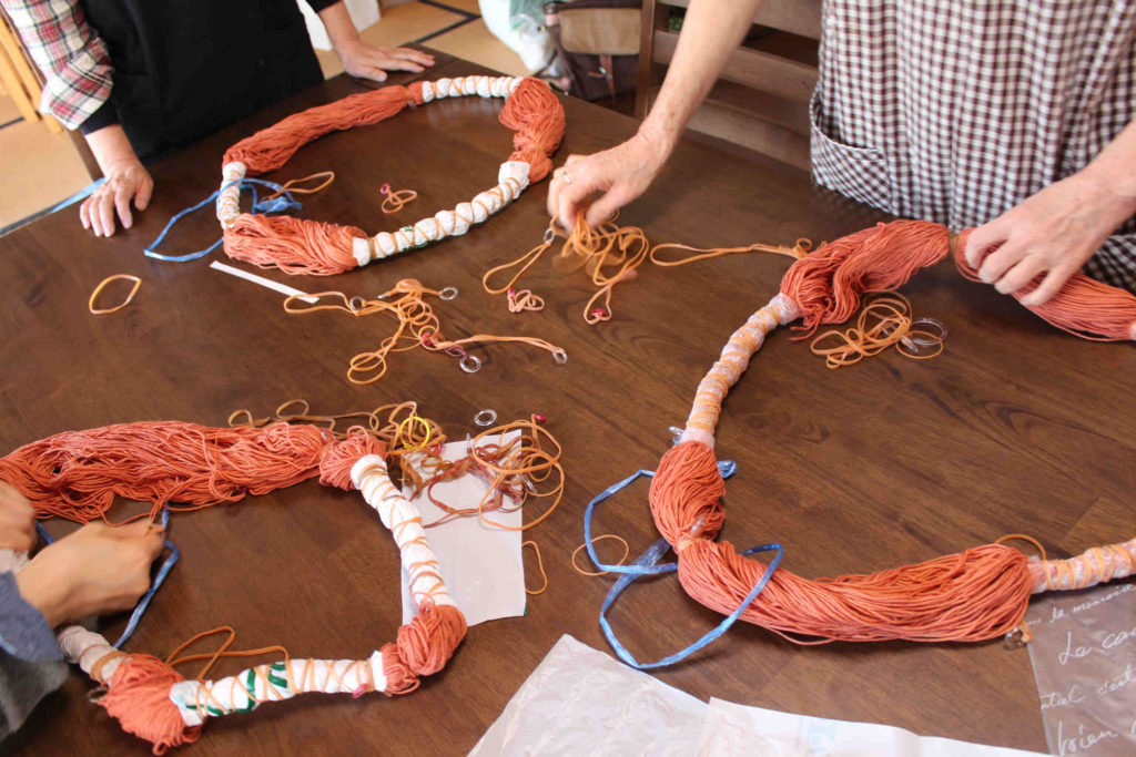 普段は布やストールなどを染めているので、糸の扱いに慣れるまでちょっと手間取る方も・・・。輪ゴムなどで絞って防染し、染めていきます。