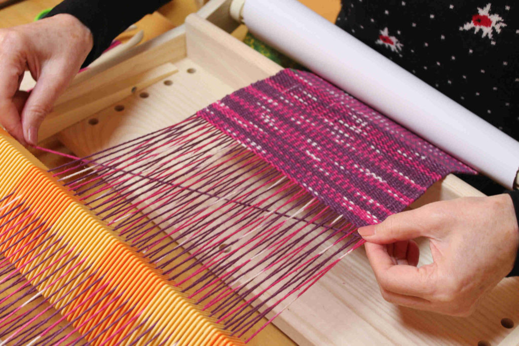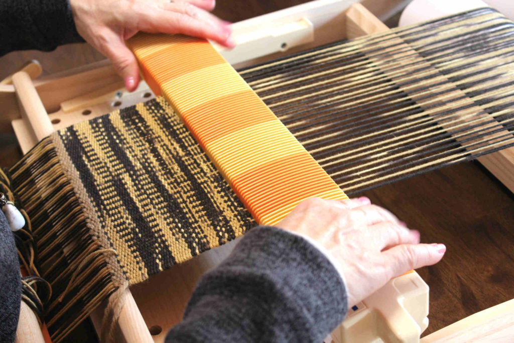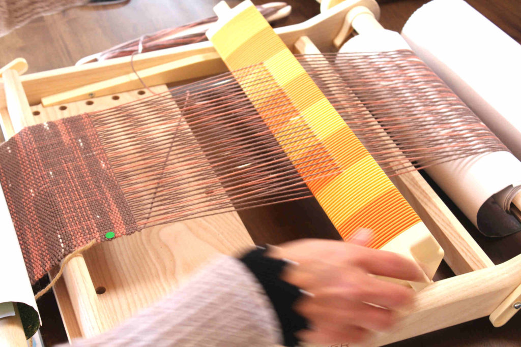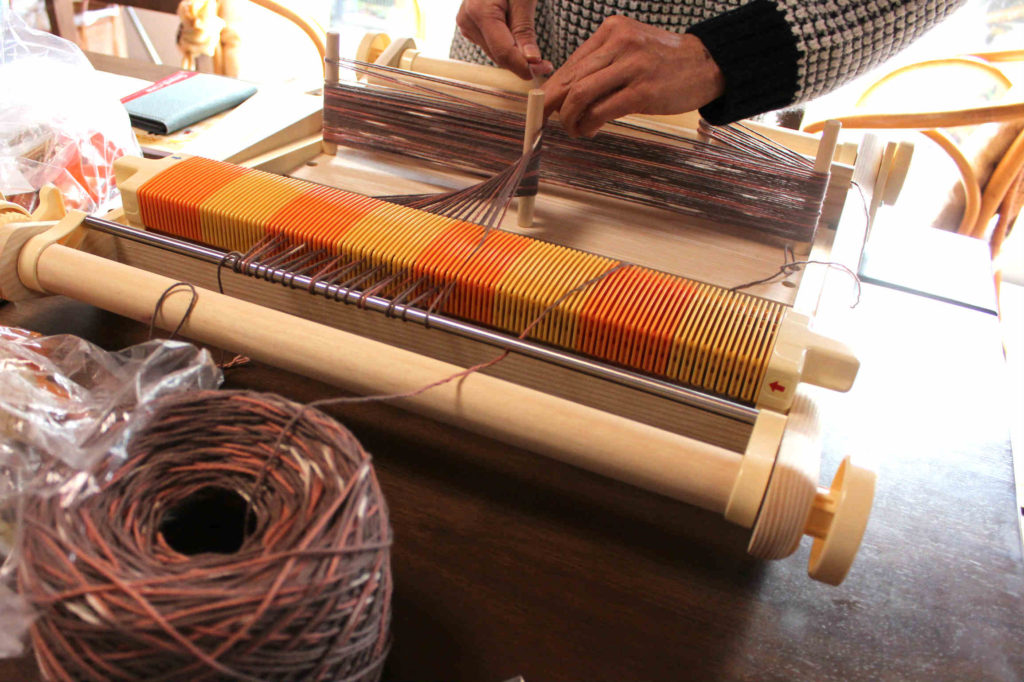 通常の織機はタテ糸の整経だけでとても大変ですが、この卓上織機はすごく使いやすく作られているので、初めて織をする方でも大きなトラブルもなくタテ糸の整経ができました。