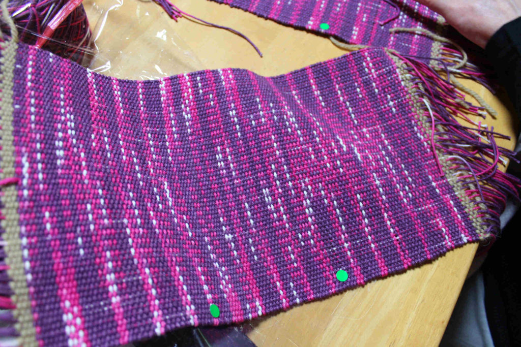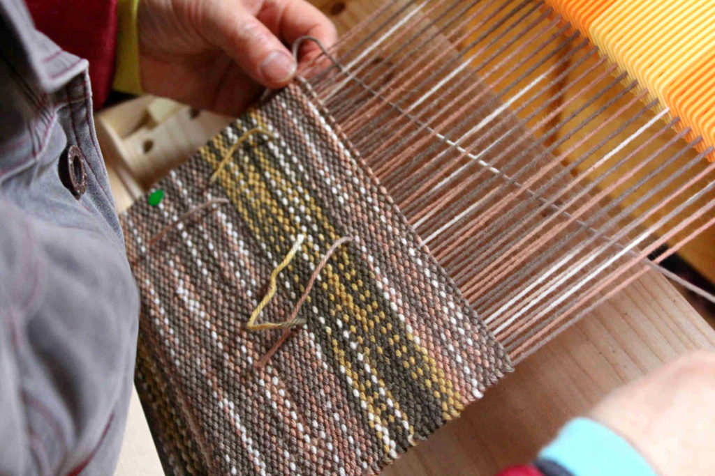 こちらの生徒さんは、イヌマキで染めた糸で織りながらところどころに栗のいがで染めた糸も織り込まれていました。