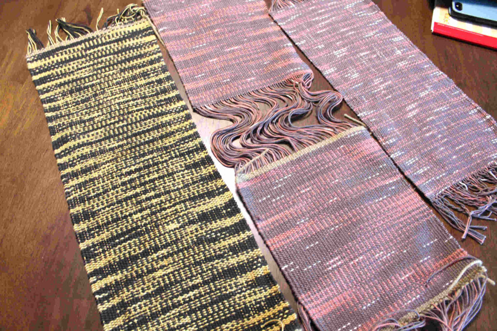 タテヨコ同じ糸を使った平織で織の技法としてはいちばんオーソドックスなやり方ですが、さまざまな色合い・模様の作品が織り上がりました!