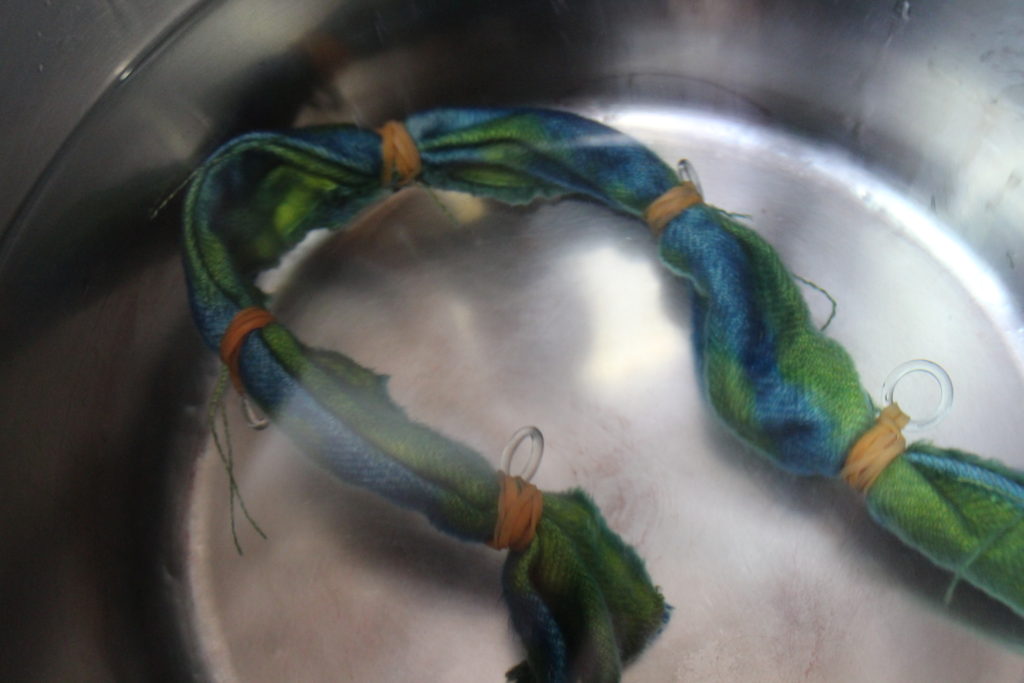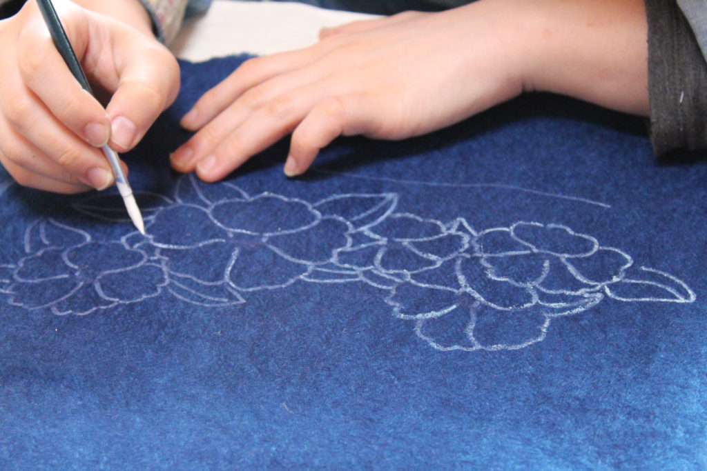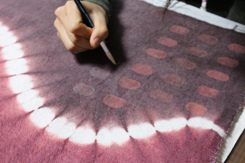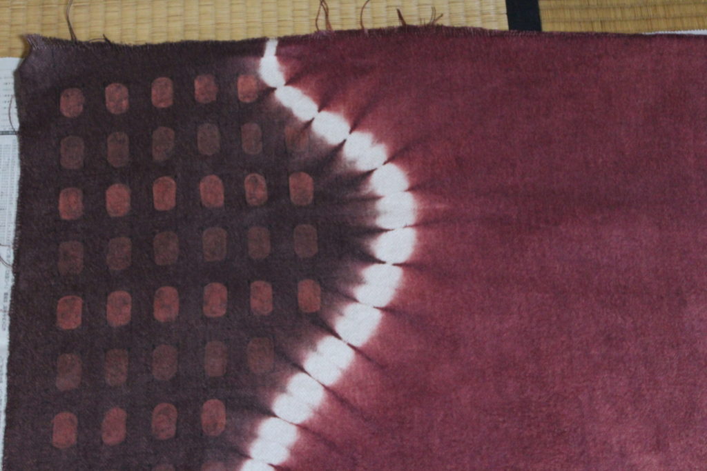 鉄媒染の側にスズとチタンを使って着抜技法で模様を描きました。この続きはご自宅で作業をされますが、どう仕上がってくるかとても楽しみです。