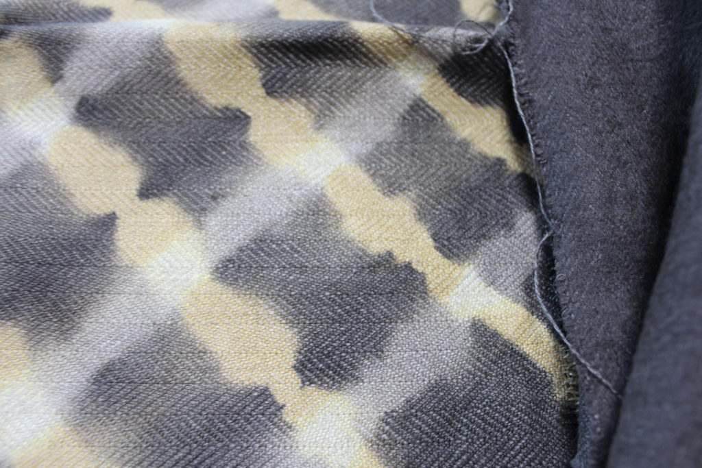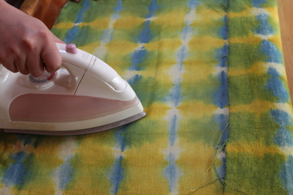 Kさんの作品は、最初にメリケンカルカヤで鮮やかな黄色を染め、その後から藍染を加えて「黄色+青色=緑」を格子状に表現しています。もう片側は、藍染めした後から、藍抜染技法で花模様を筆で描いています。細い線できれいに描けています。