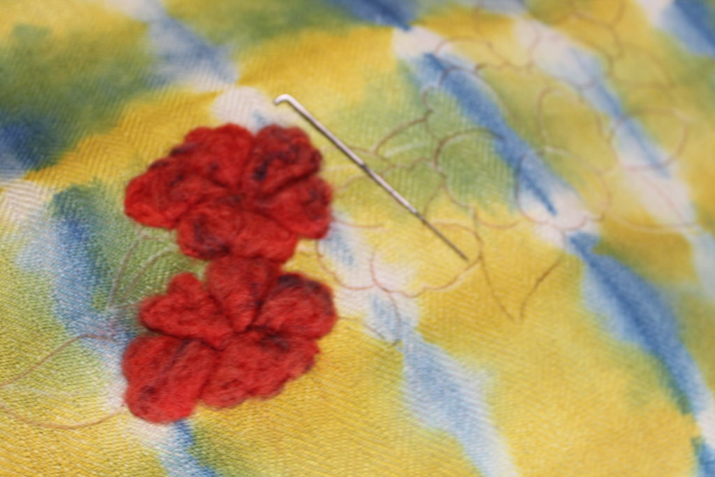 茜で染めた原毛にほんの少し黒っぽい色を足して花びらに表情をつけています。花びら一枚一枚を丁寧にフェルトで表現しています。