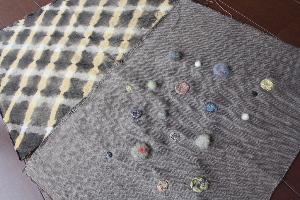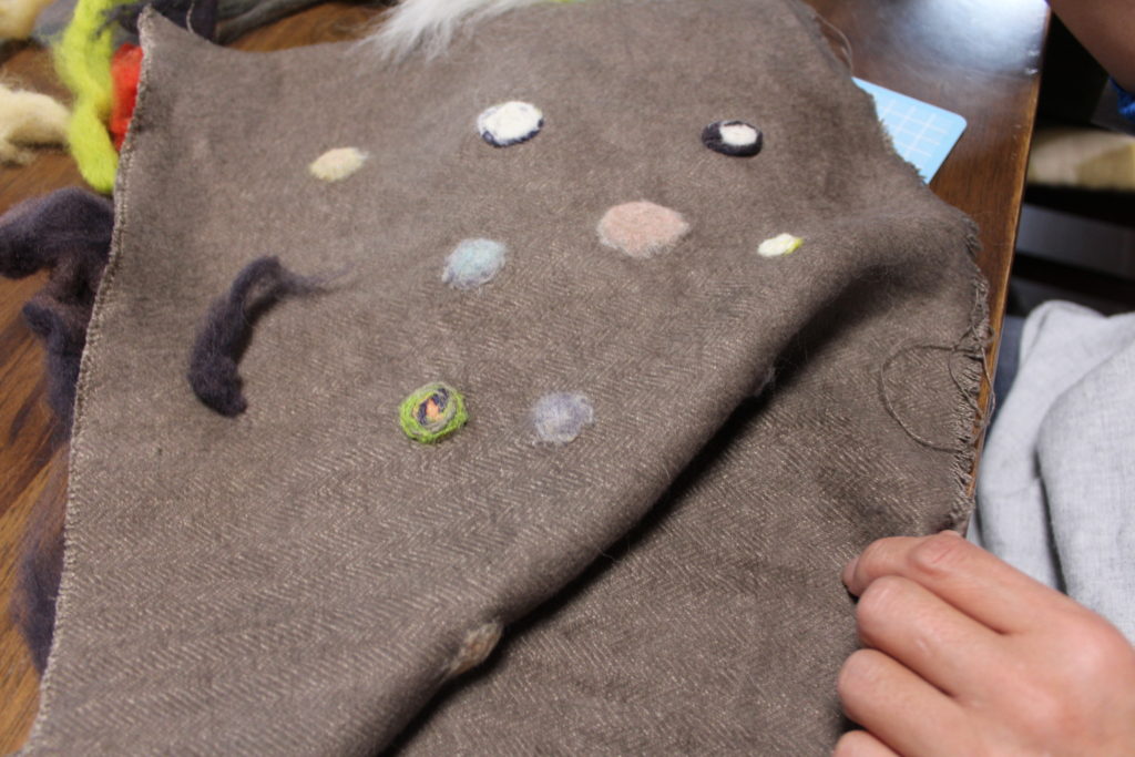 フェルティングの作業がとても気に入って、いくつもいくつも丸を作る作業をしていました。フェルトの裏と表の表情が違う事を発見して、その両方を模様として生かしています。