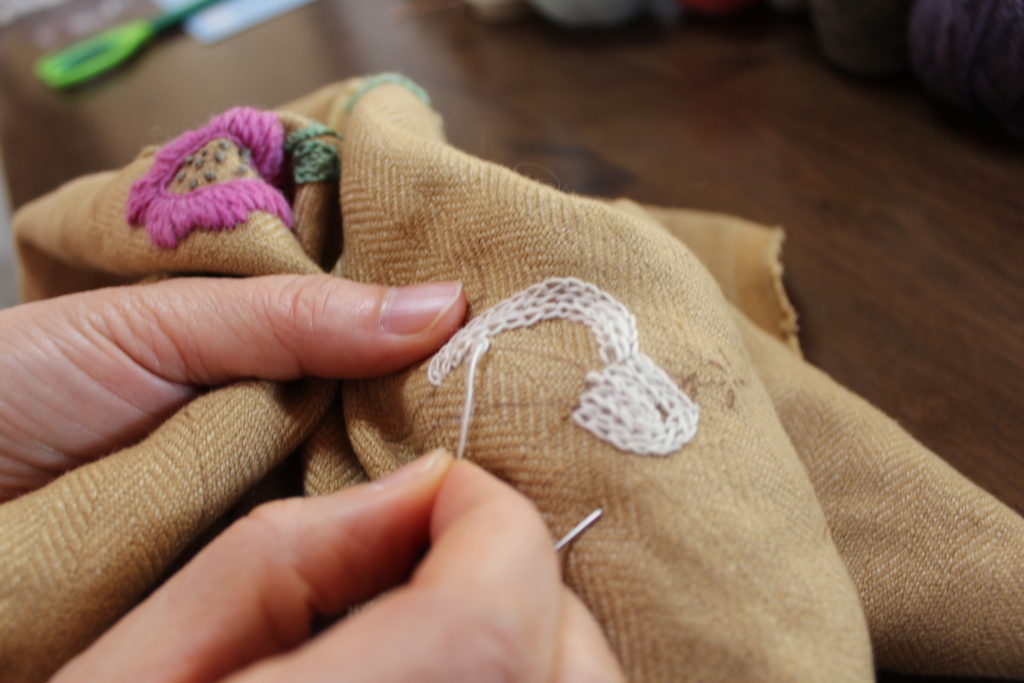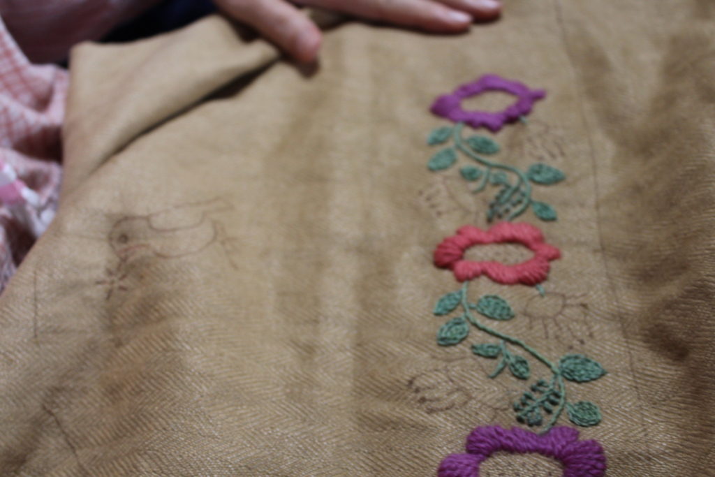 これまで、あまり刺繍をしたことがないというMさんですが、刺繍の解説本を見て、ちょっと練習しただけでこんなにきれいな刺繍が出来上がりました。鳥のチェーンステッチも可愛くできました。