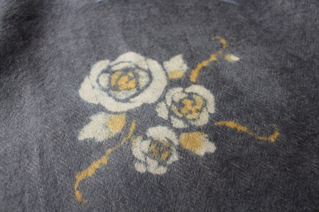 栗で染めて鉄媒染をした面には、着抜技法でバラの模様を表現しています。