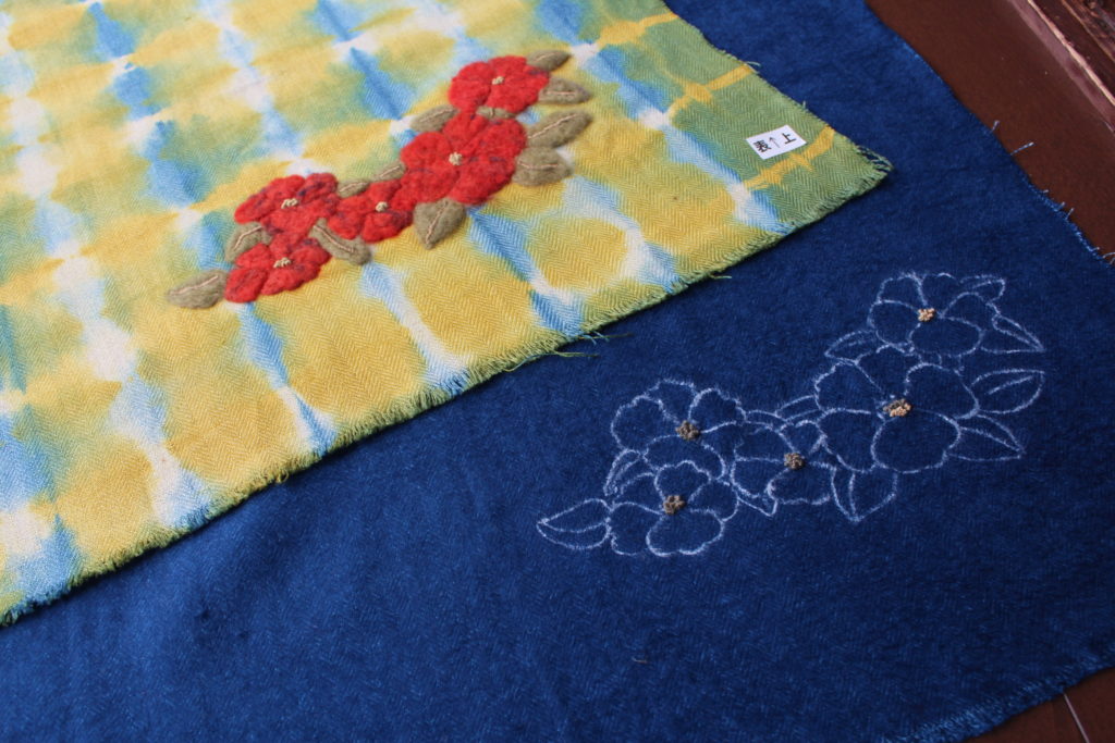 ウメノキゴケ、茜、藍、クチナシ+藍、月桂樹、栗などの草木染した美しい糸が、刺繍によって上手に生かされています。