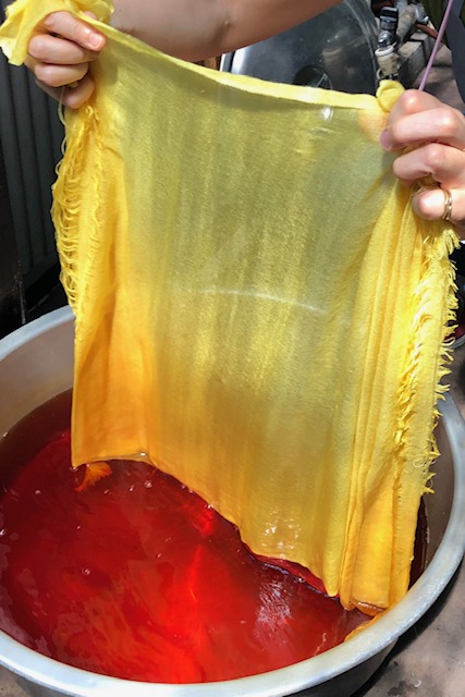 土日クラス、月火クラス、2日間で染めたのは、大判シルクストール、麻生平の座布団生地、麻のランナーです。座布団用の染めあがった生地は仕立てに出しました。しっかりした和座布団が出来上がってくるのが楽しみです。