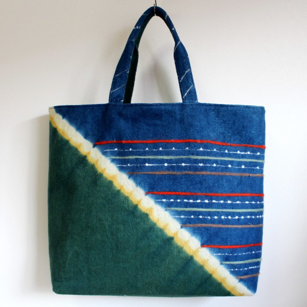 用いた技法:ライン絞り、重ね染め、藍抜染、ニードルフェルティング、刺繍