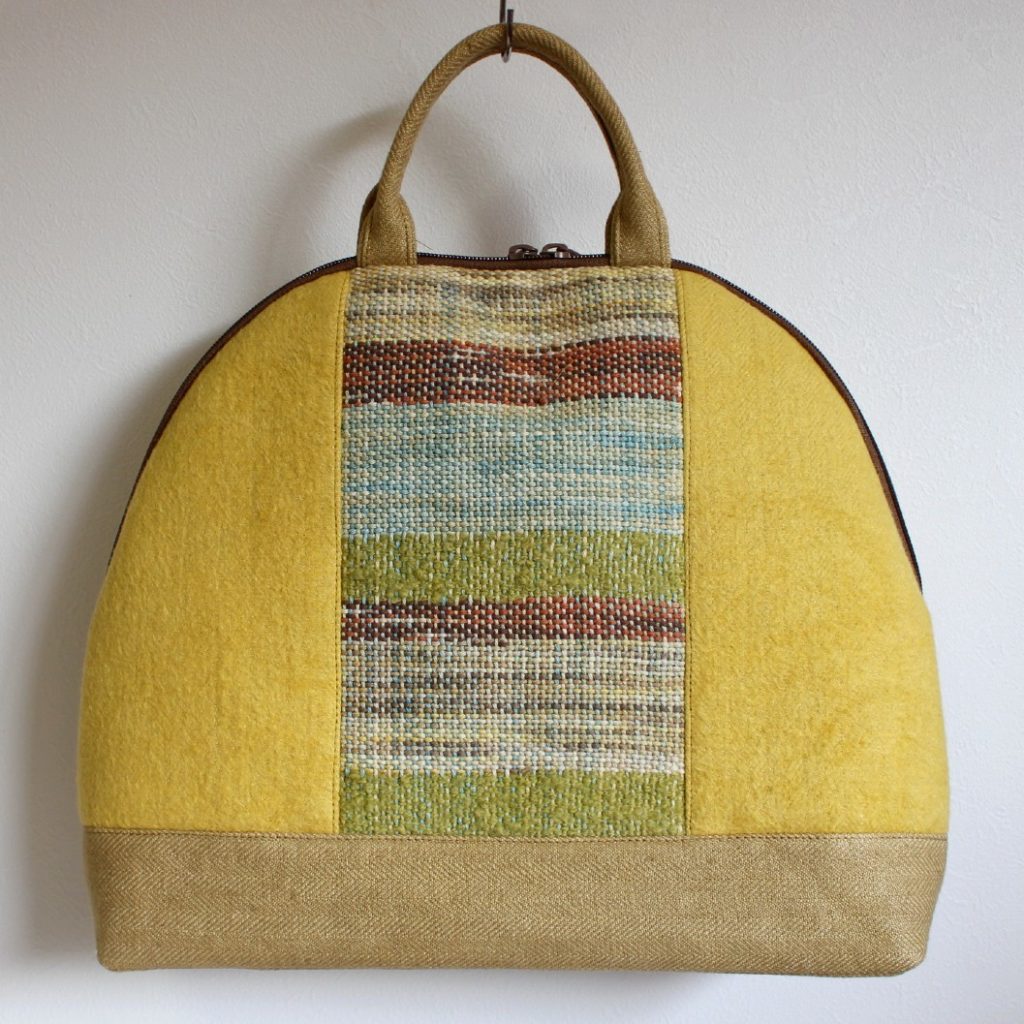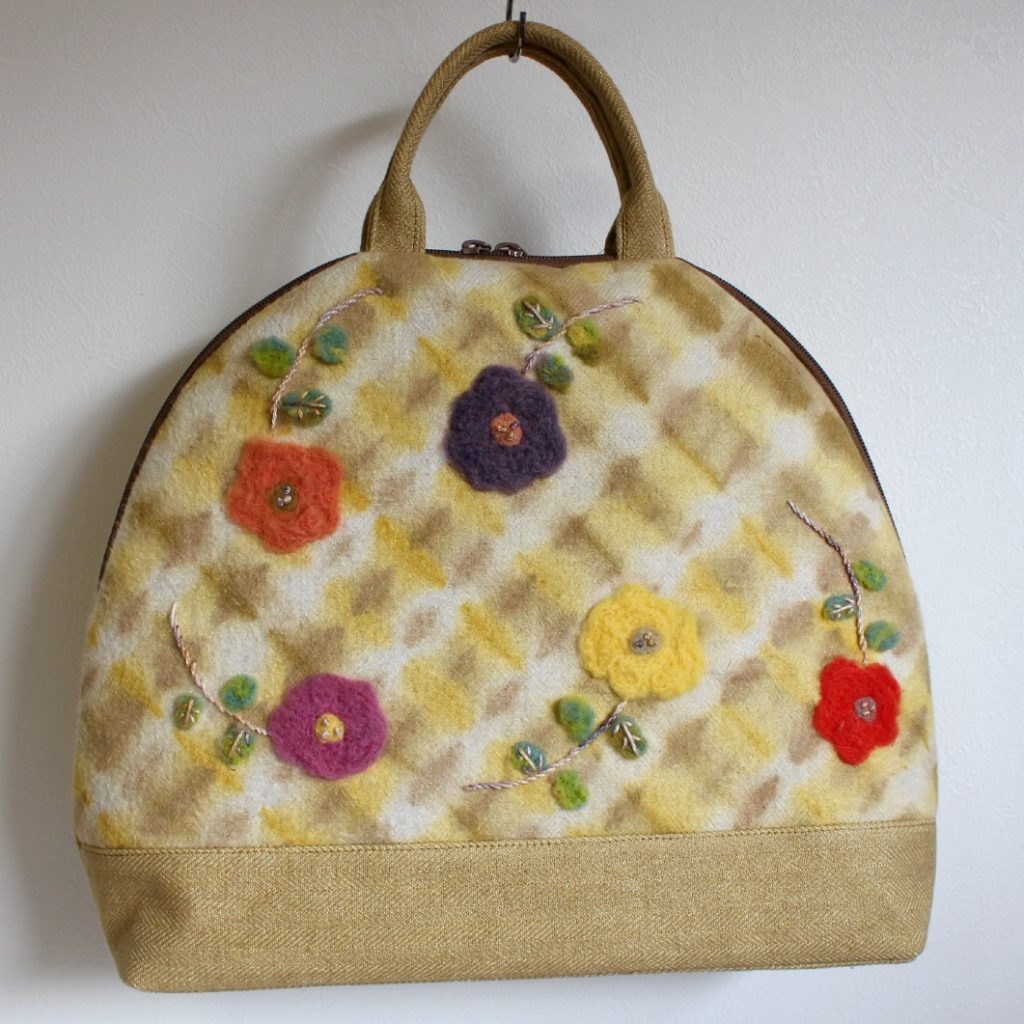 新しく習ったニードルフェインティングや刺繍、手織りの部分も入れて、春に持てるようなイメージで作ってみました。
