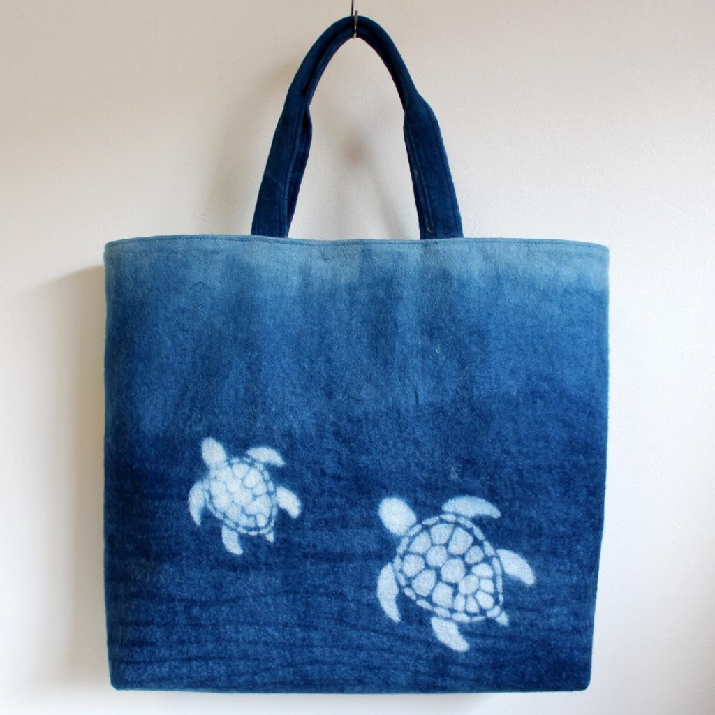 私が染めるもののほとんどは海がテーマで、海にいる時に自分が見たものやイメージしたもの、インスパイアされたものです。今回の作品は、ロサンゼルスにいる時ほぼ毎日サーフィンで見かけるイルカと夕方に見る夕焼けを表し、裏面は大好きなハワイで見かけるウミガメです。